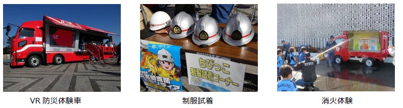 はしご車搭乗体験(参加者抽選型)、VR防災体験車、消火体験(まちかど防災訓練車)、車両展示、