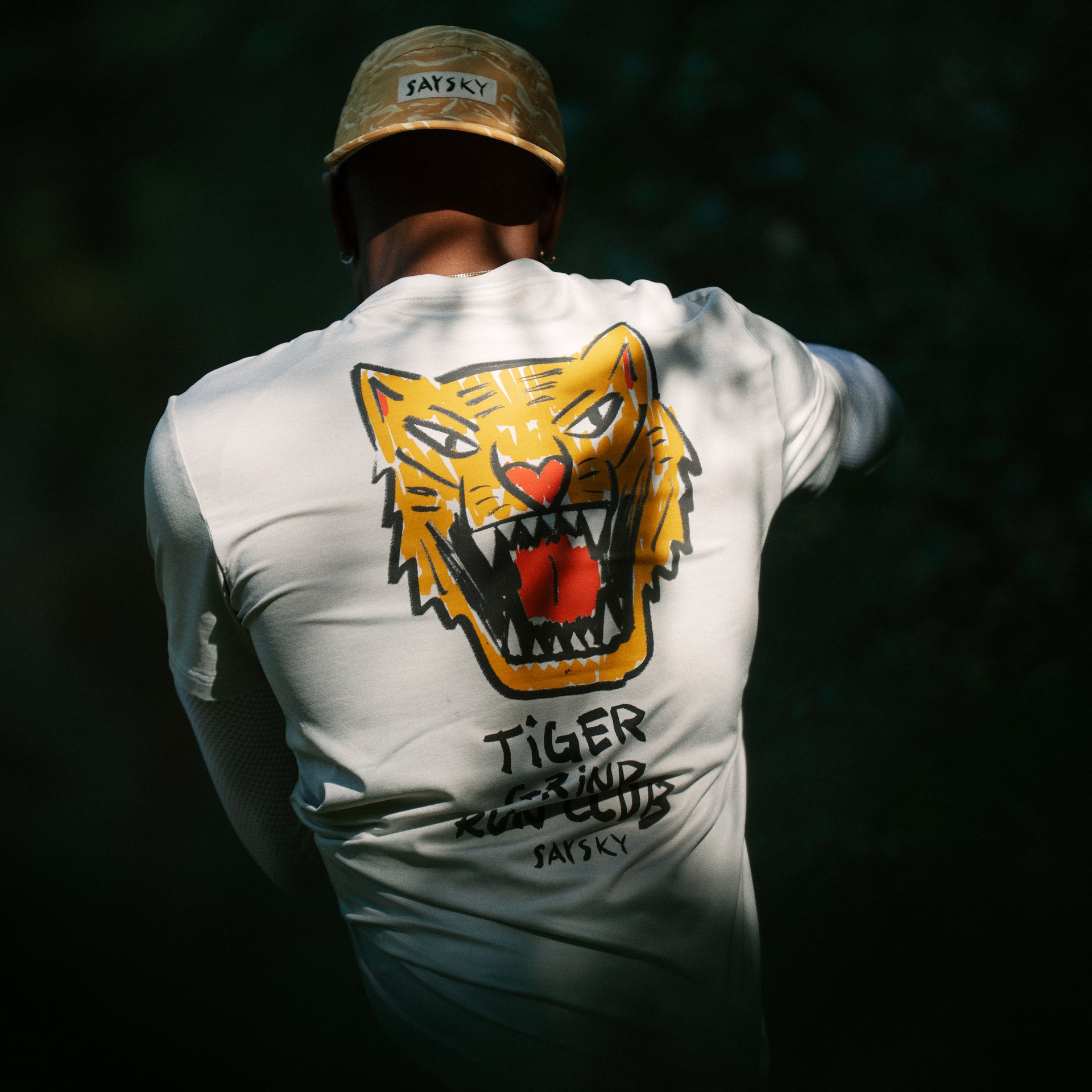 オリジナルのSAYSKYタイガーカモを力強く再解釈したダスティイエローのプリントに、創業者ラース・ペデルセンによる特別な手描きグラフィックを配置。困難や過酷なトレーニングを受け入れる、ランナーの強靭な精神を体現しています。