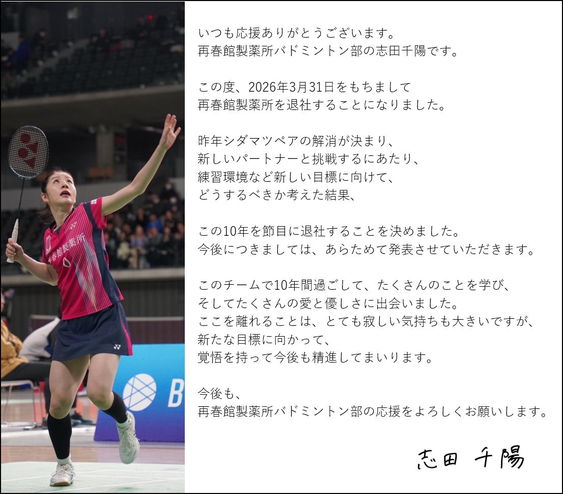 株式会社再春館製薬所(本社:熊本県上益城郡益城町、代表取締役社長:西川正明)所属の志田千陽(しだ・ちはる)選手が、2026年3月31日をもちましてチームを退団することをお知らせいたします。