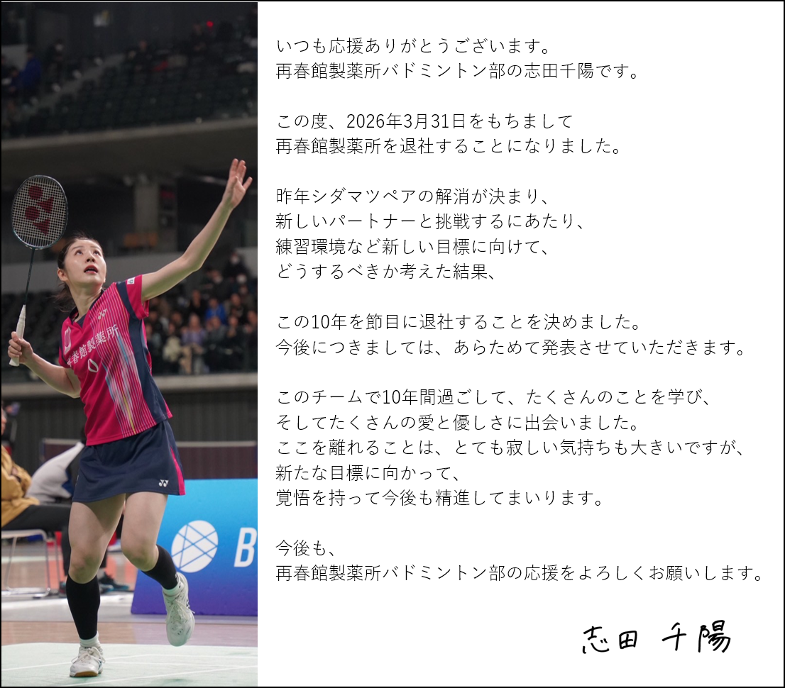 株式会社再春館製薬所(本社:熊本県上益城郡益城町、代表取締役社長:西川正明)所属の志田千陽(しだ・ちはる)選手が、2026年3月31日をもちましてチームを退団することをお知らせいたします。