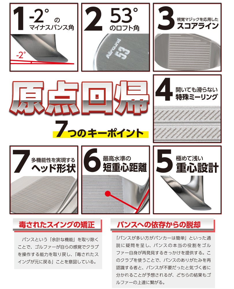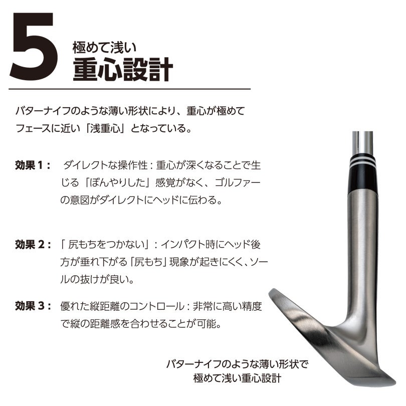 効果:自在にフェースを開けるため、 スクエアに構えれば53°、少し開けば 56° 大きく開けば60°のロブウェッジの役割までカバーできる 「マルチウェッジ」 として機能する。