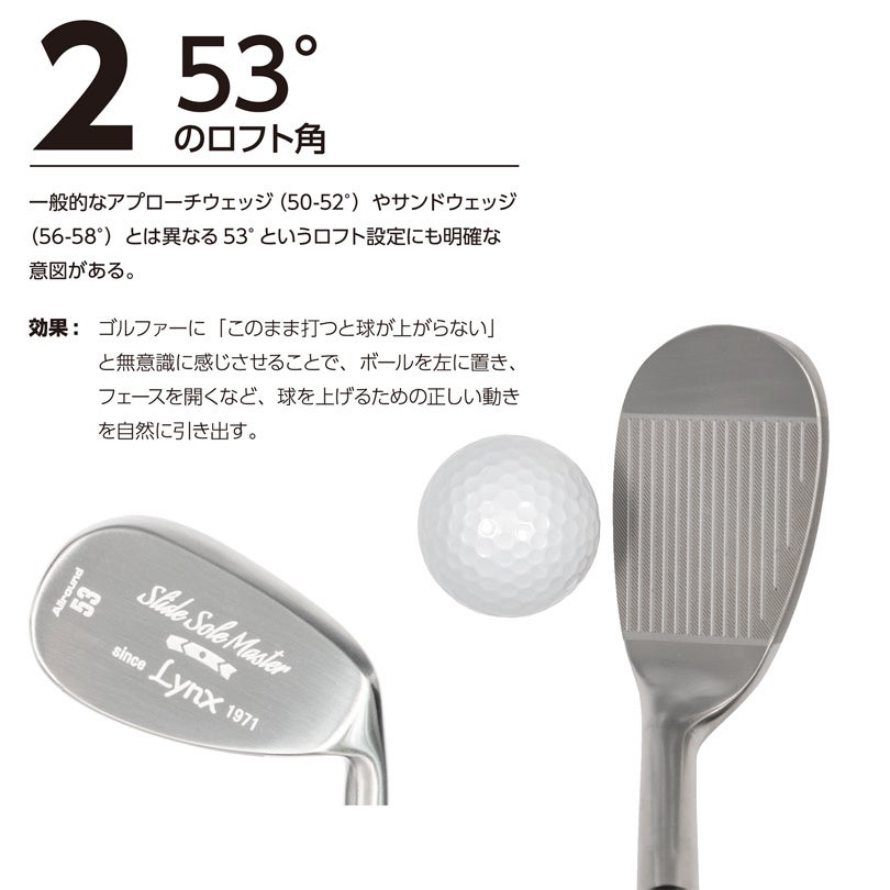 一般的なアプローチウェッジ (50-52°) やサンドウェッジ(56-58°)とは異なる53° というロフト設定にも明確な意図がある。