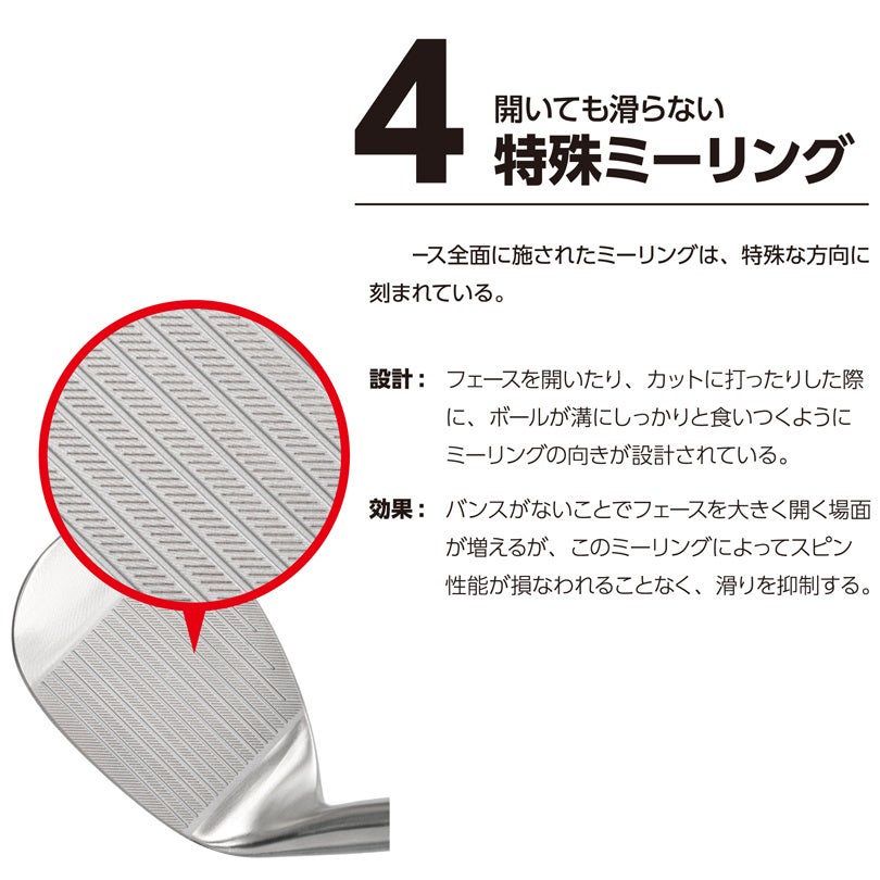 効果: バンスがないことでフェースを大きく開く場面が増えるが、このミーリングによってスピン