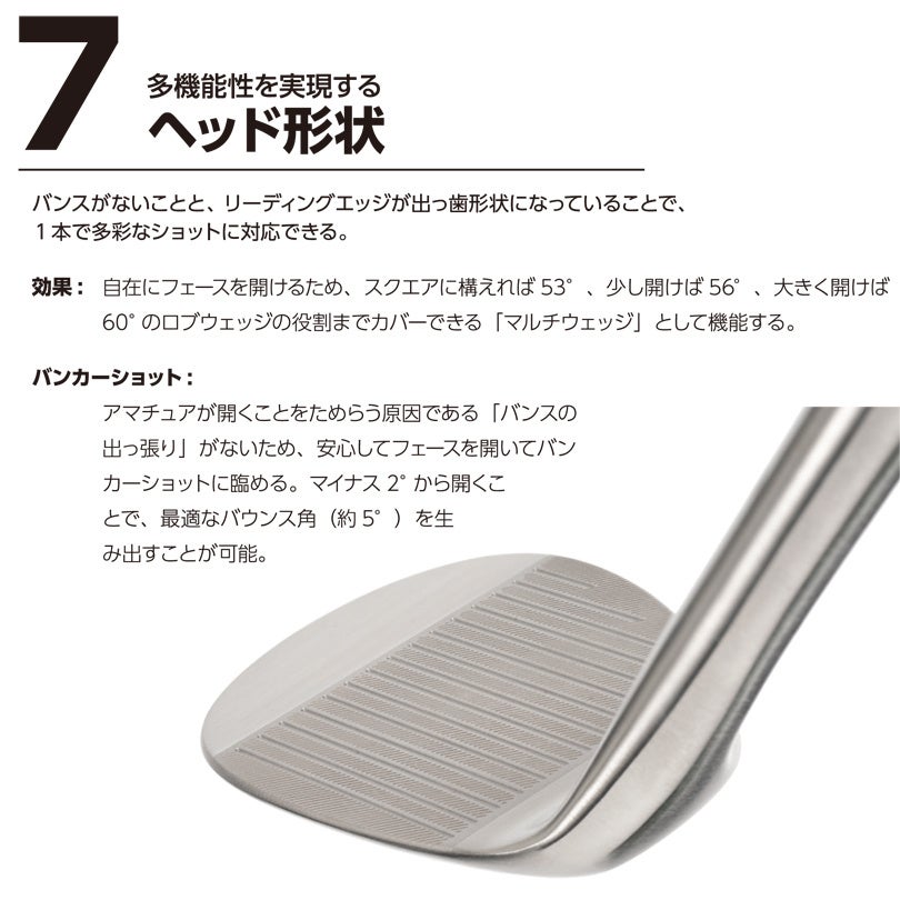効果:自在にフェースを開けるため、 スクエアに構えれば53°、少し開けば 56° 大きく開けば60°のロブウェッジの役割までカバーできる 「マルチウェッジ」 として機能する。
