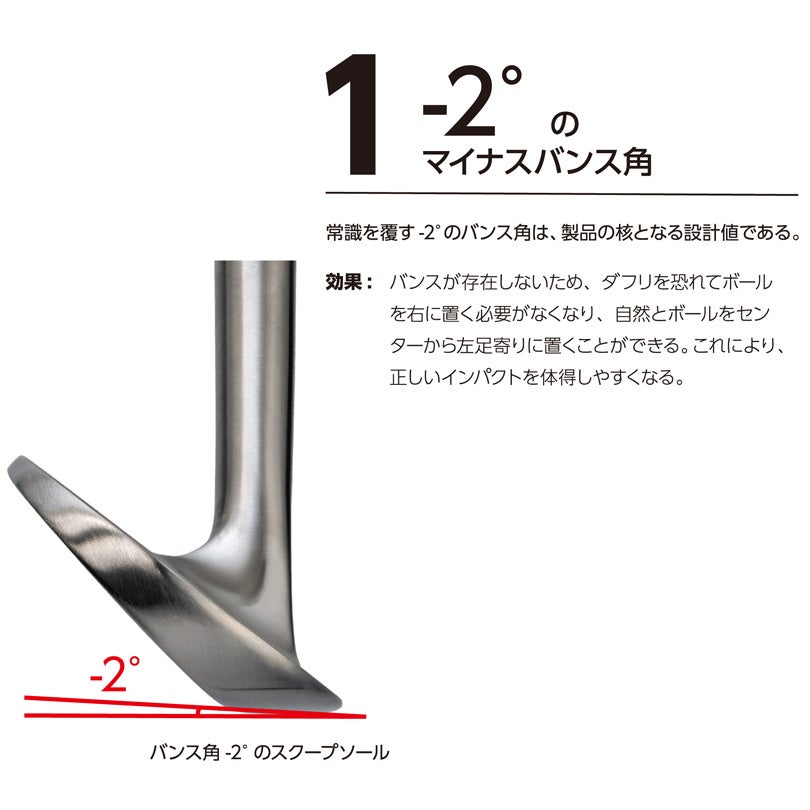 アマチュアが開くことをためらう原因である 「バンスの出っ張り」がないため、安心してフェースを開いてバンカーショットに臨める。マイナス2° から開くことで、最適なバウンス角 (約 5°)を生み出すことが可能。