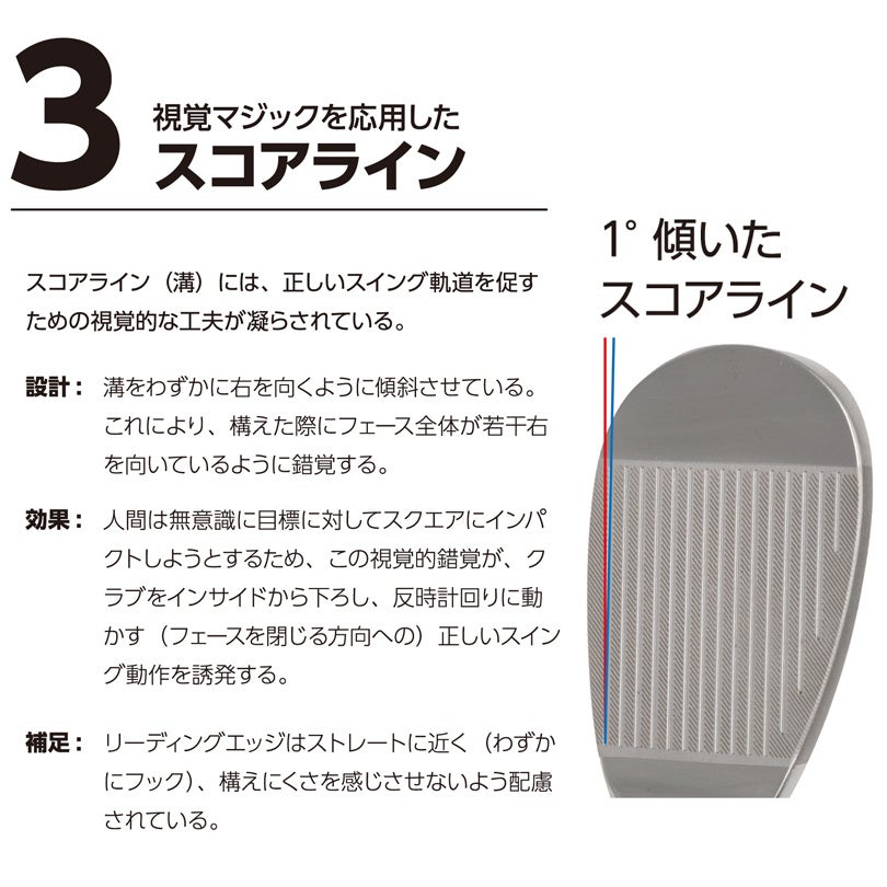 スコアライン(溝)には、正しいスイング軌道を促すための視覚的な工夫が凝らされている。