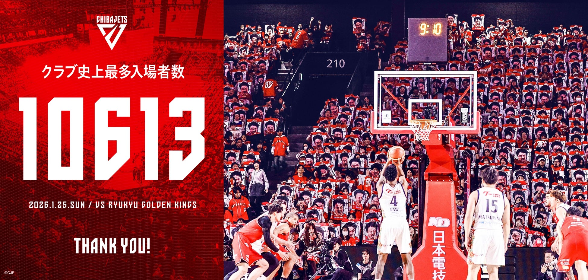 千葉ジェッツは1月25日(日)に南船橋「ららアリーナ東京ベイ」にて、りそなグループ B.LEAGUE 2025-26 SEASON 第 19 節 千葉ジェッツ VS 琉球ゴールデンキングスを開催し、【10,613人】を動員しクラブ史上最多入場者数をさらに更新し、今シーズン3度目の記録更新となりました。この日のゲームでは琉球を相手にラスト1プレーまで勝敗がわからない試合を展開するが、63-65で残念ながら敗戦。現時点(2/12)では27勝10敗で東地区2位を走っている。