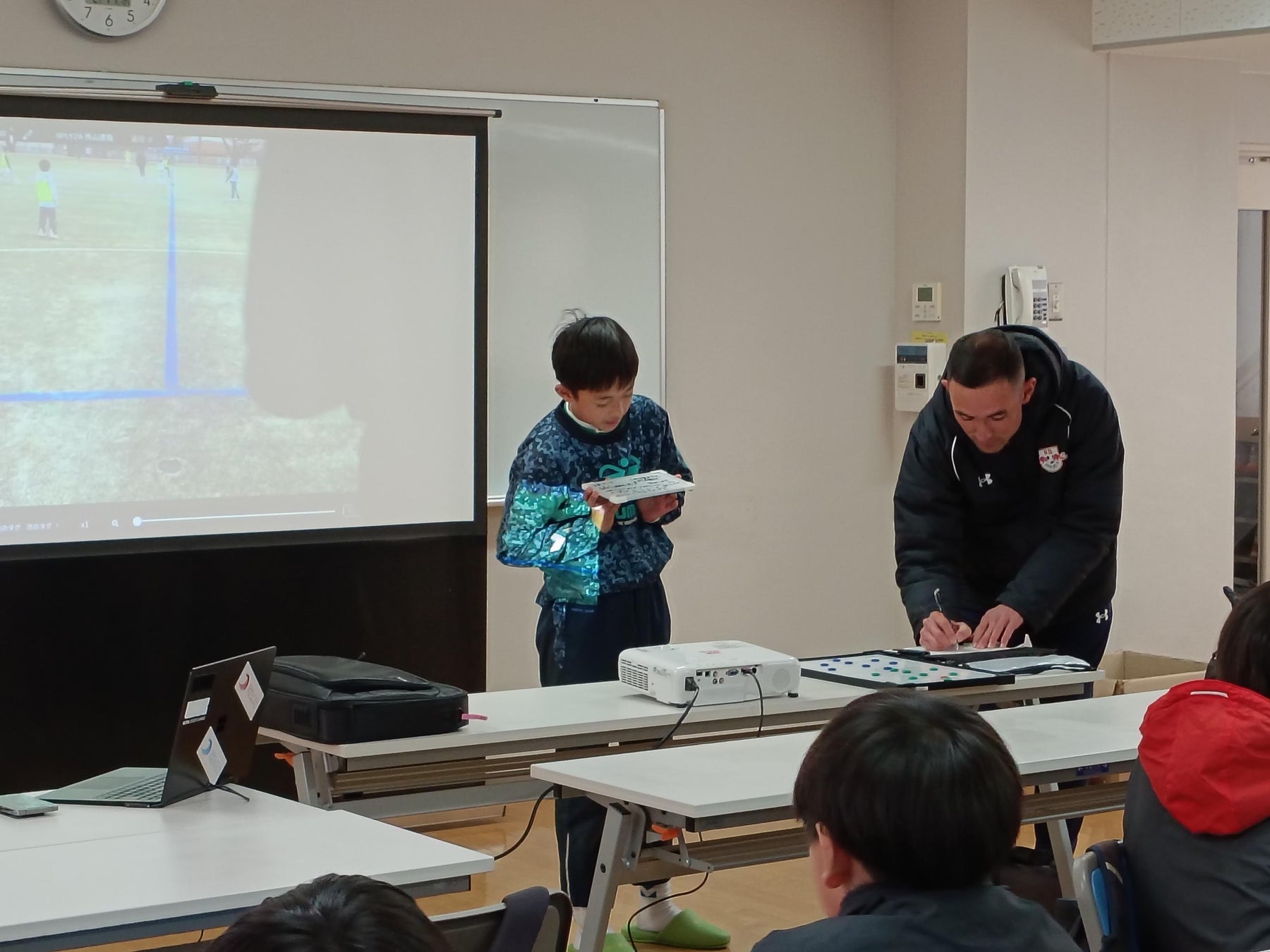 本教室は、参加した子どもたちが自分の実際のプレイ映像を客観的に振り返り、課題発見から解決まで主体的に取組むことでスキル向上とチーム力強化を目指すもので、熊谷市内のサッカー教室では初の取組です。