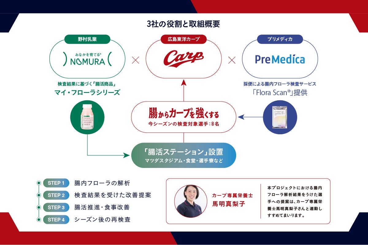 株式会社広島東洋カープ(本社:広島県広島市南区代表取締役社長:松田 元)と、予防医療領域における検査サービスを展開する株式会社プリメディカ(本社:東京都港区、代表取締役社長 兼 CEO:富永 朋)、「おなかを育てる」腸活専門メーカーの野村乳業株式会社(本社:広島県安芸郡府中町、代表取締役:野村 和弘)は、2025年シーズンより開始した、選手の腸内フローラ(腸内細菌叢)を科学的に分析・改善することで、体調管理やパフォーマンス向上をサポートすることを目指す『GUT POWER PROJECT(ガット パワー プロジェクト)』の取り組み結果をうけ、2026年も腸からカープを強くする取り組みを継続することをお知らせします。