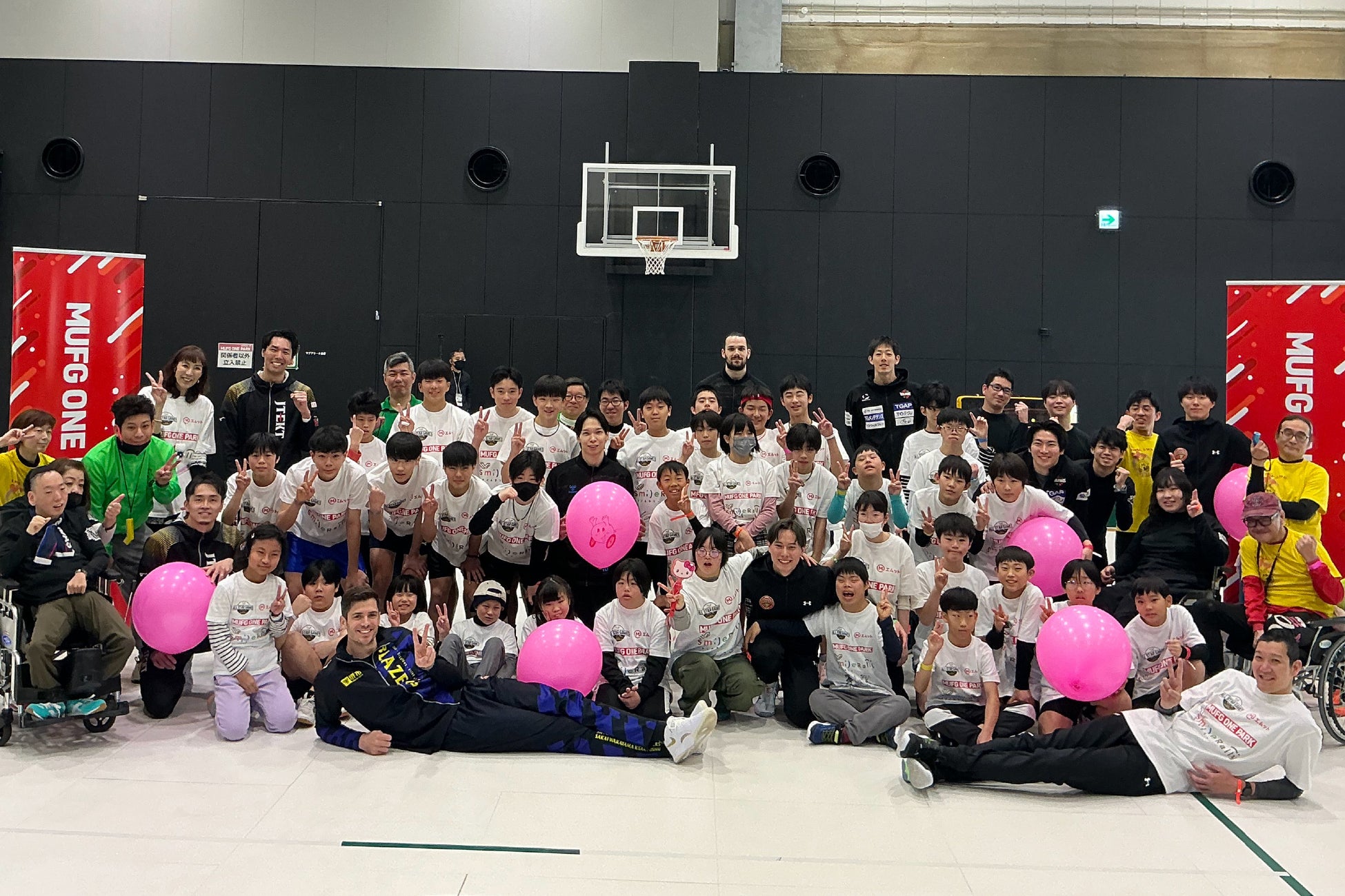 サブアリーナで行われた「ふうせんバレー」は、バドミントンコートを使用し、障がいのある3-4名と障がいのない人2-3名の6名がチームとなり、メンバー全員が直径40cmのふうせんに1度は触れ、かつ10回以内に相手コートに返すという全員参加型のパラスポーツ。クラブチームの監督から、「障がい者の方たちと、心のバリアフリーを体験してきてください」と送り出された中学生やデイサービスで風船を使った遊びを楽しんでいる支援学校の生徒らが、オールスター選手と交流した。