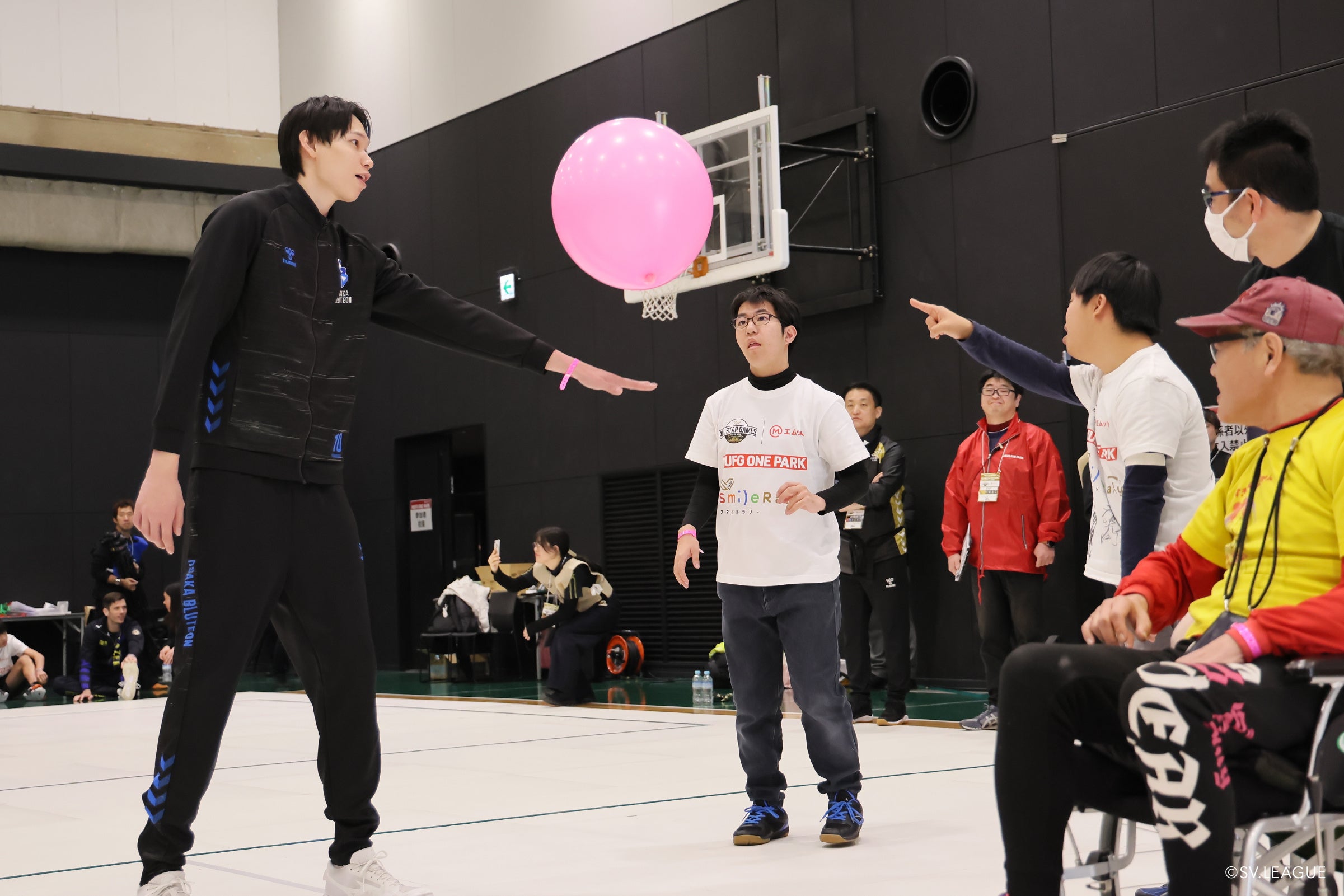 サブアリーナで行われた「ふうせんバレー」は、バドミントンコートを使用し、障がいのある3-4名と障がいのない人2-3名の6名がチームとなり、メンバー全員が直径40cmのふうせんに1度は触れ、かつ10回以内に相手コートに返すという全員参加型のパラスポーツ。クラブチームの監督から、「障がい者の方たちと、心のバリアフリーを体験してきてください」と送り出された中学生やデイサービスで風船を使った遊びを楽しんでいる支援学校の生徒らが、オールスター選手と交流した。