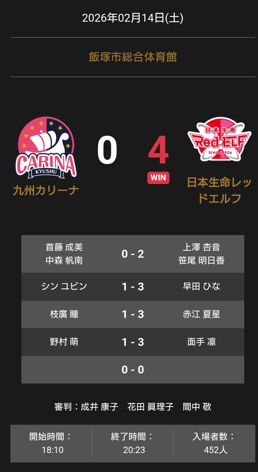 ホームプレスリリース ノジマTリーグ 2025-2026 公式戦 2月14日開催 九州カリーナ vs 日本生命レッドエルフ 試合結果 2026年02月14日 21時20分 公開|スポーツマニア編集部プレスリリース 一般社団法人Tリーグのプレスリリース 九州カリーナと日本生命レッドエルフの試合は、4-0で日本生命レッドエルフが勝利しました。