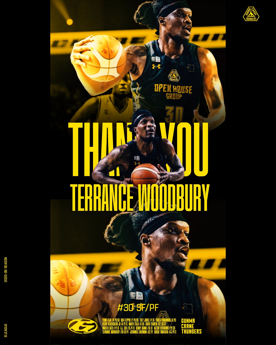 この度、群馬クレインサンダーズでは、契約満了のため、#30 テレンス・ウッドベリー選手が退団することとなりましたのでお知らせいたします。