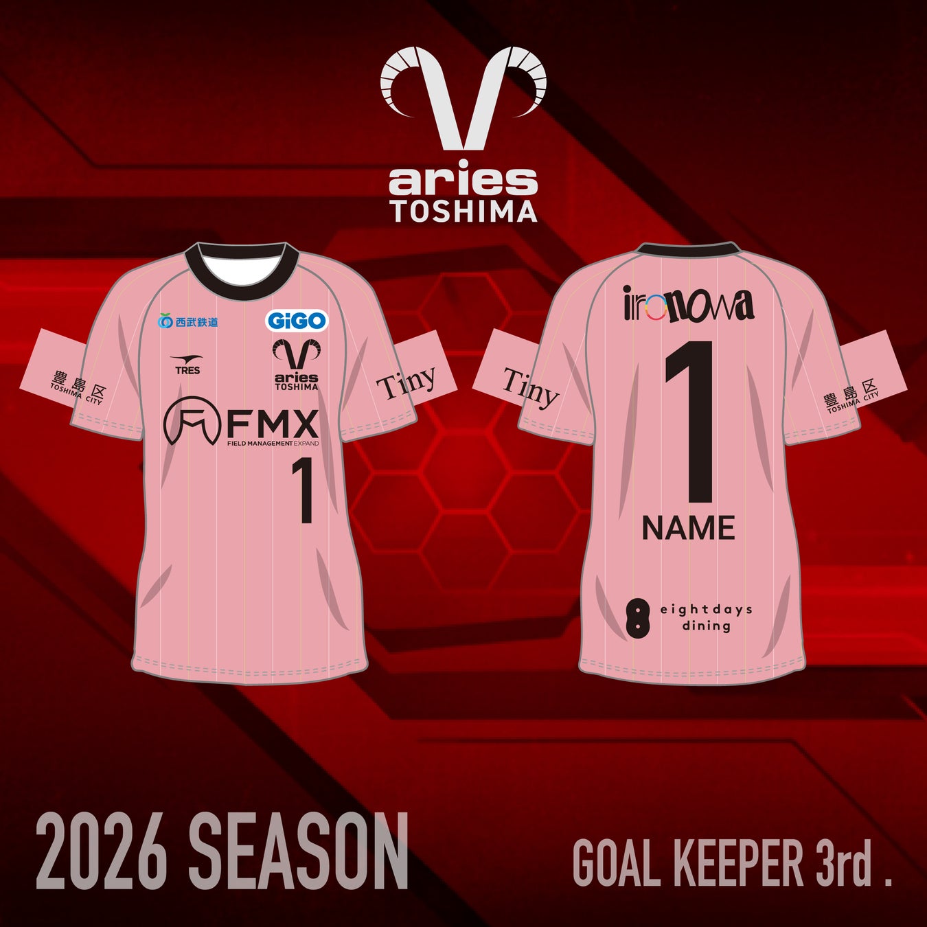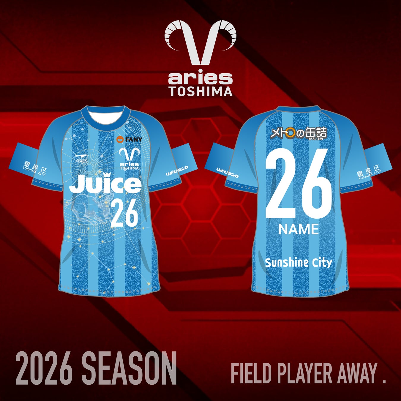 クラブ名の由来である「牡羊座(ARIES)」と、豊島のビル群の光を模したストライプを融合させました 。漆黒の闇の中でも決して消えない星々のように、アウェイの地でも勝利への道を自ら照らし出し、ファンを導く「道標」となる決意を込めています 。