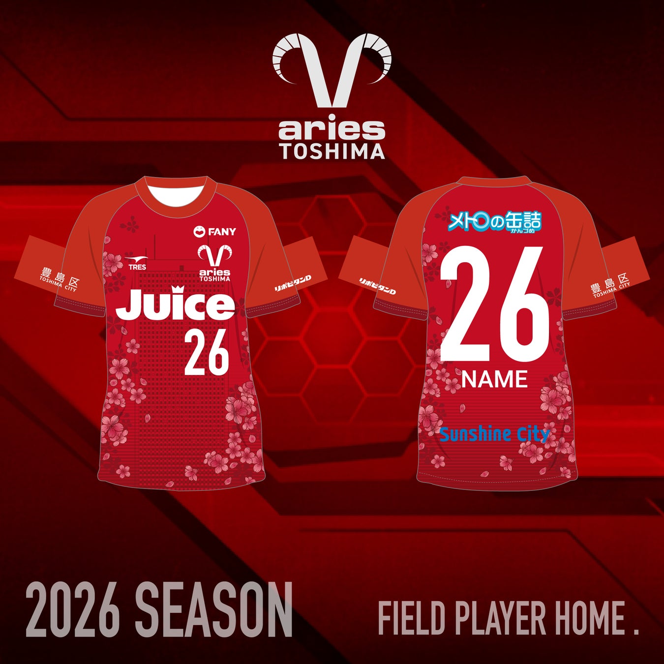 クラブの情熱と力強さを象徴する赤(GKはビビッドな黄)を基調とし、豊島区のシンボルである「桜(ソメイヨシノ)」と「豊島区のビル群」をモチーフとして全体に配置しました。地域に深く根差すクラブの姿勢を表現し、ファンが「自分たちの街のユニフォーム」と感じられるデザインに仕上げました。