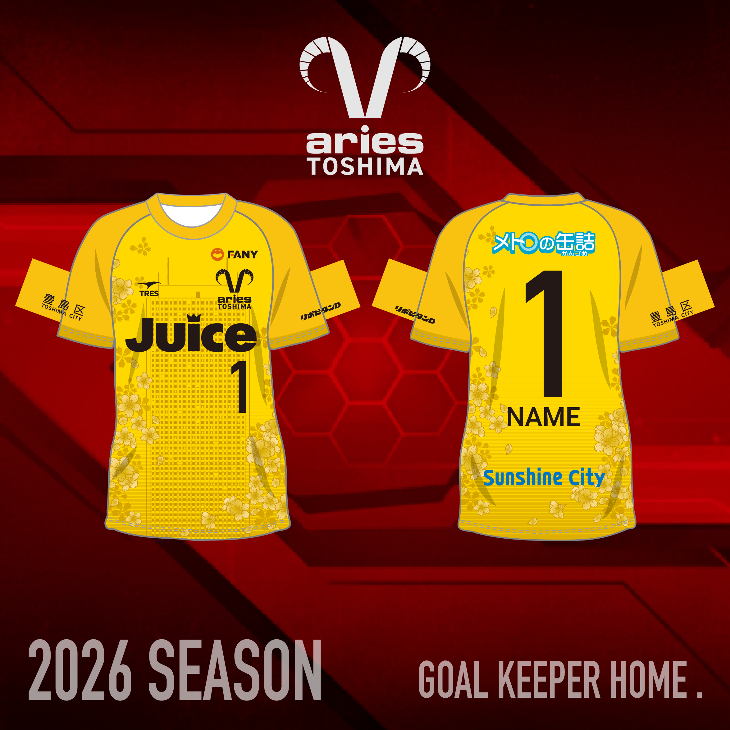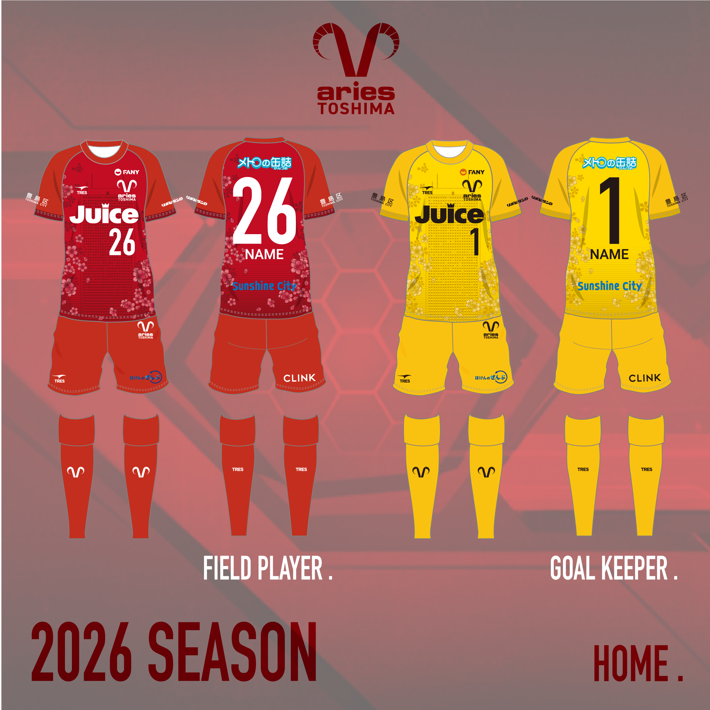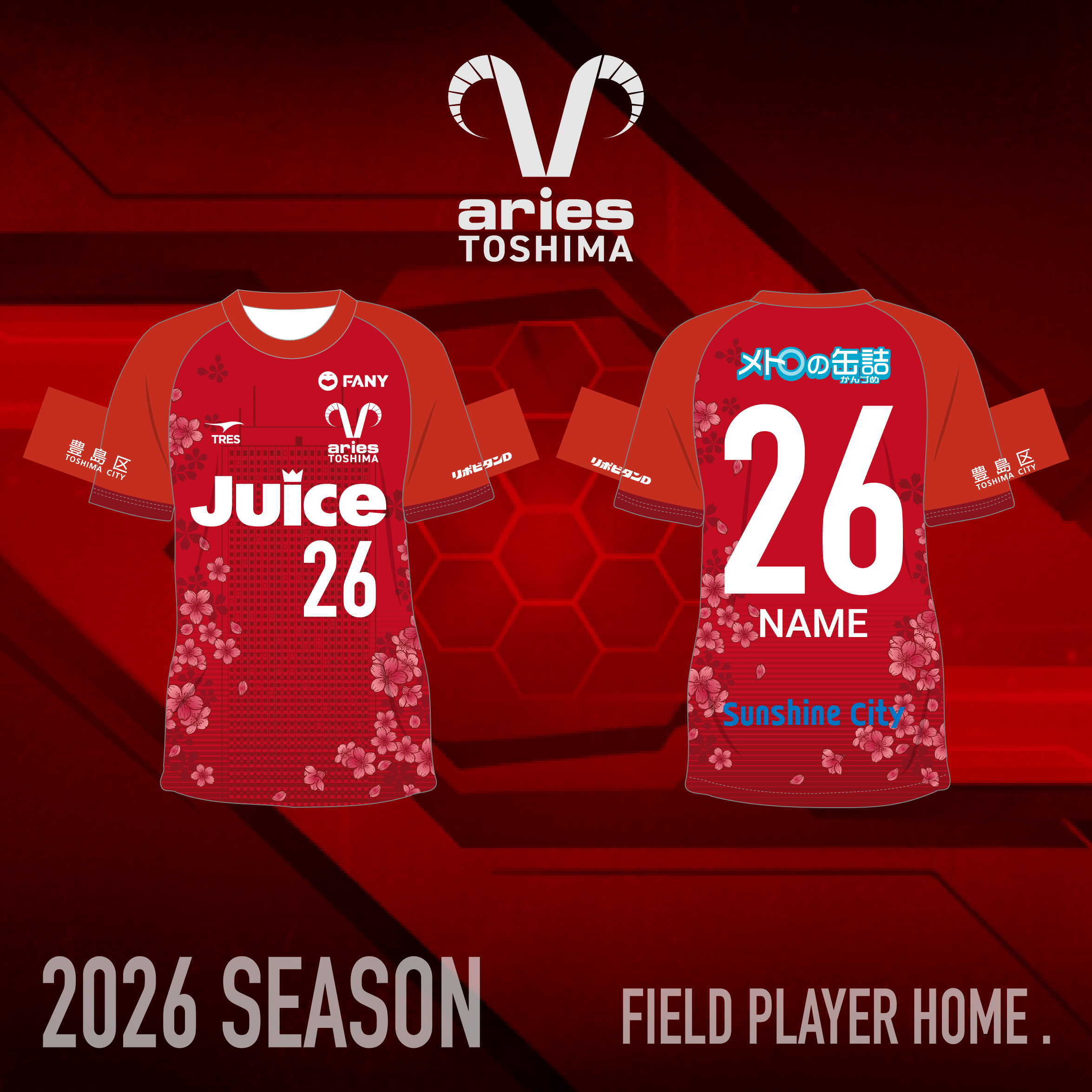 クラブの情熱と力強さを象徴する赤(GKはビビッドな黄)を基調とし、豊島区のシンボルである「桜(ソメイヨシノ)」と「豊島区のビル群」をモチーフとして全体に配置しました。地域に深く根差すクラブの姿勢を表現し、ファンが「自分たちの街のユニフォーム」と感じられるデザインに仕上げました。