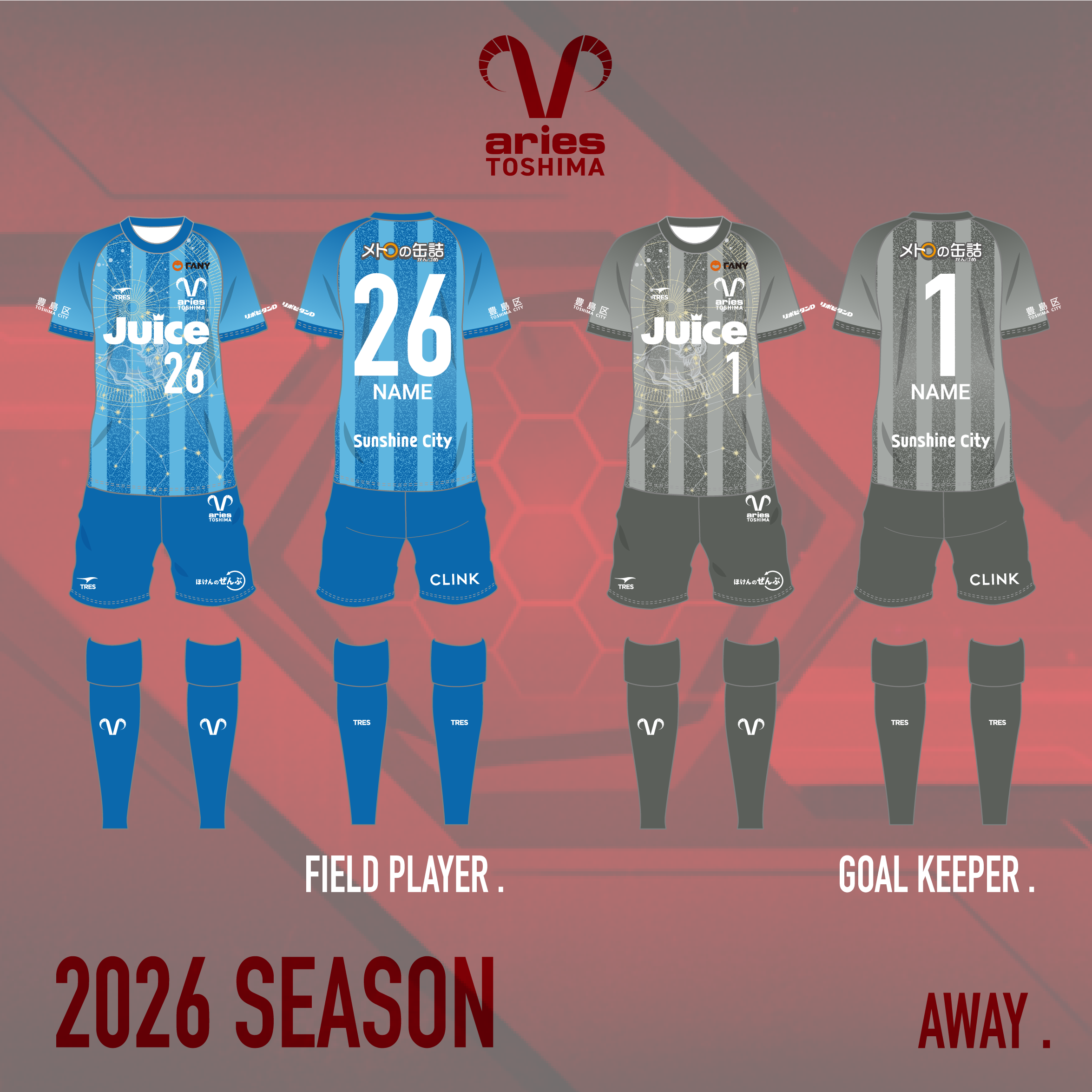 クラブ名の由来である「牡羊座(ARIES)」と、豊島のビル群の光を模したストライプを融合させました 。漆黒の闇の中でも決して消えない星々のように、アウェイの地でも勝利への道を自ら照らし出し、ファンを導く「道標」となる決意を込めています 。