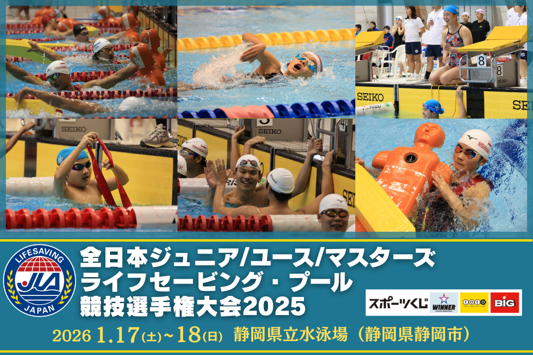 公益財団法人日本ライフセービング協会(=JLA、東京都港区、理事長/入谷拓哉)は、2026年1月17日(土)から18日(日)の二日間、静岡県立水泳場(静岡県静岡市)にて「全日本ジュニアユースマスターズライフセービング・プール競技選手権大会2025」を開催しました。