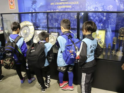 まずは歴代のトロフィーやクラブの記念展示が並ぶエリアを訪れ、子どもたちはキラキラとしたトロフィーを間近で見て目を輝かせていました。ガンバ大阪の歴史と重みを肌で感じ、憧れがさらに大きくなったようです。