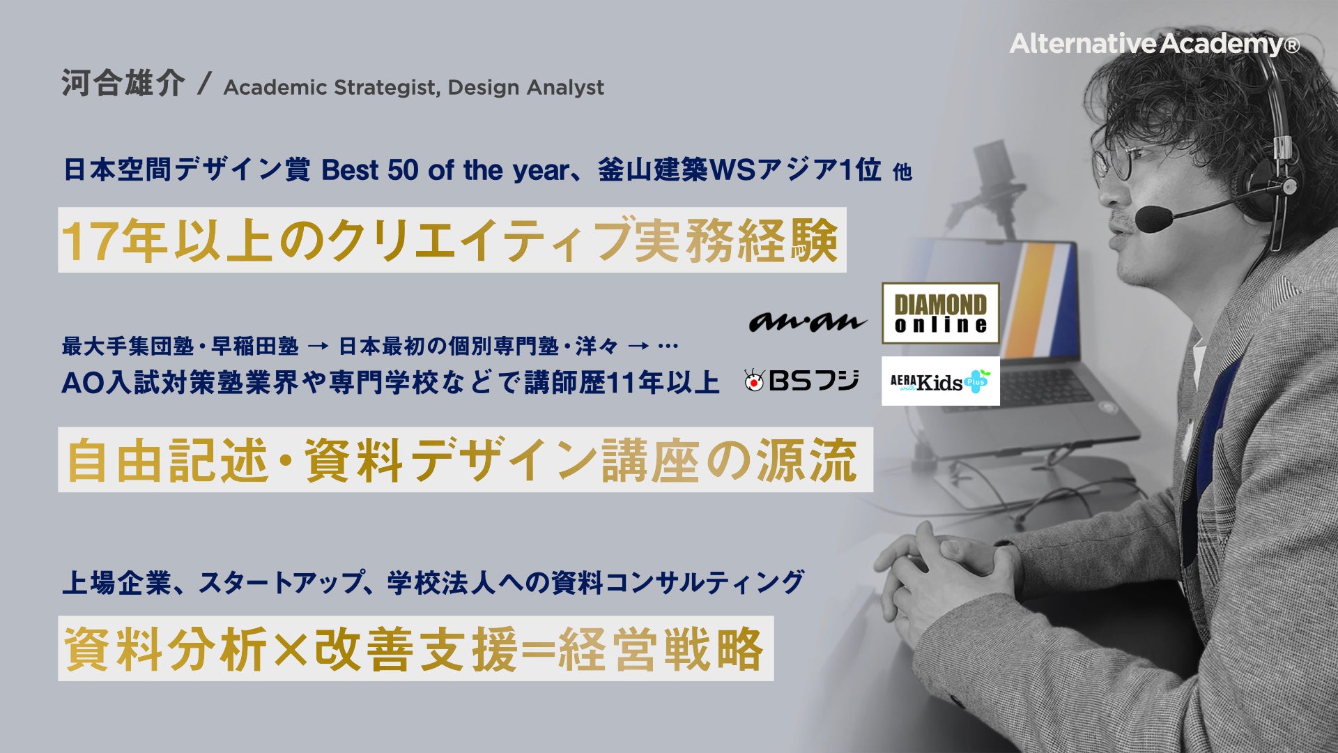 Alternative Academy®︎の代表である河合雄介は、AO入試塾業界では最大手の早稲田塾(集団授業中心)や、専門の個別塾としては最老舗である洋々の両方でトップの指導実績も持つ日本屈指の講師。