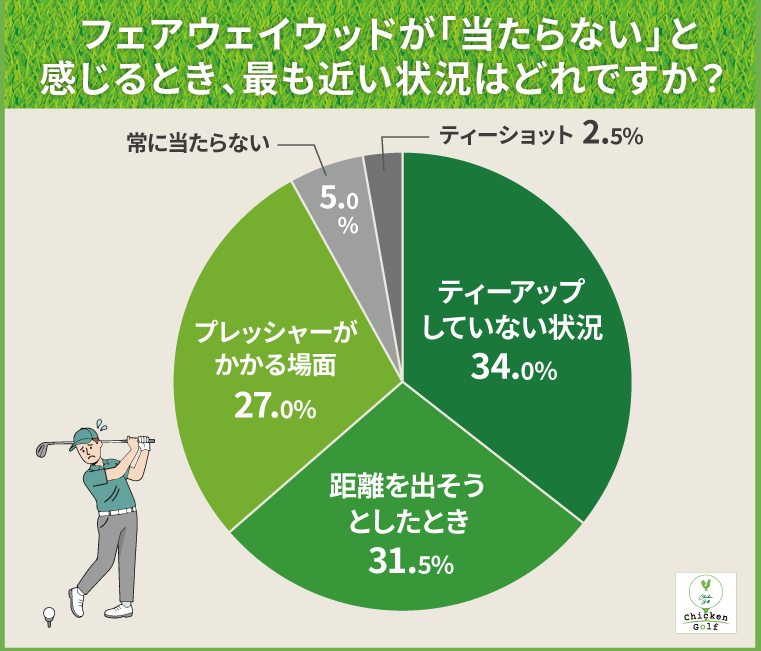 フェアウェイウッドが当たらないと感じる場面として最も多かったのが、「地面から打つとき」で34%を占めました。