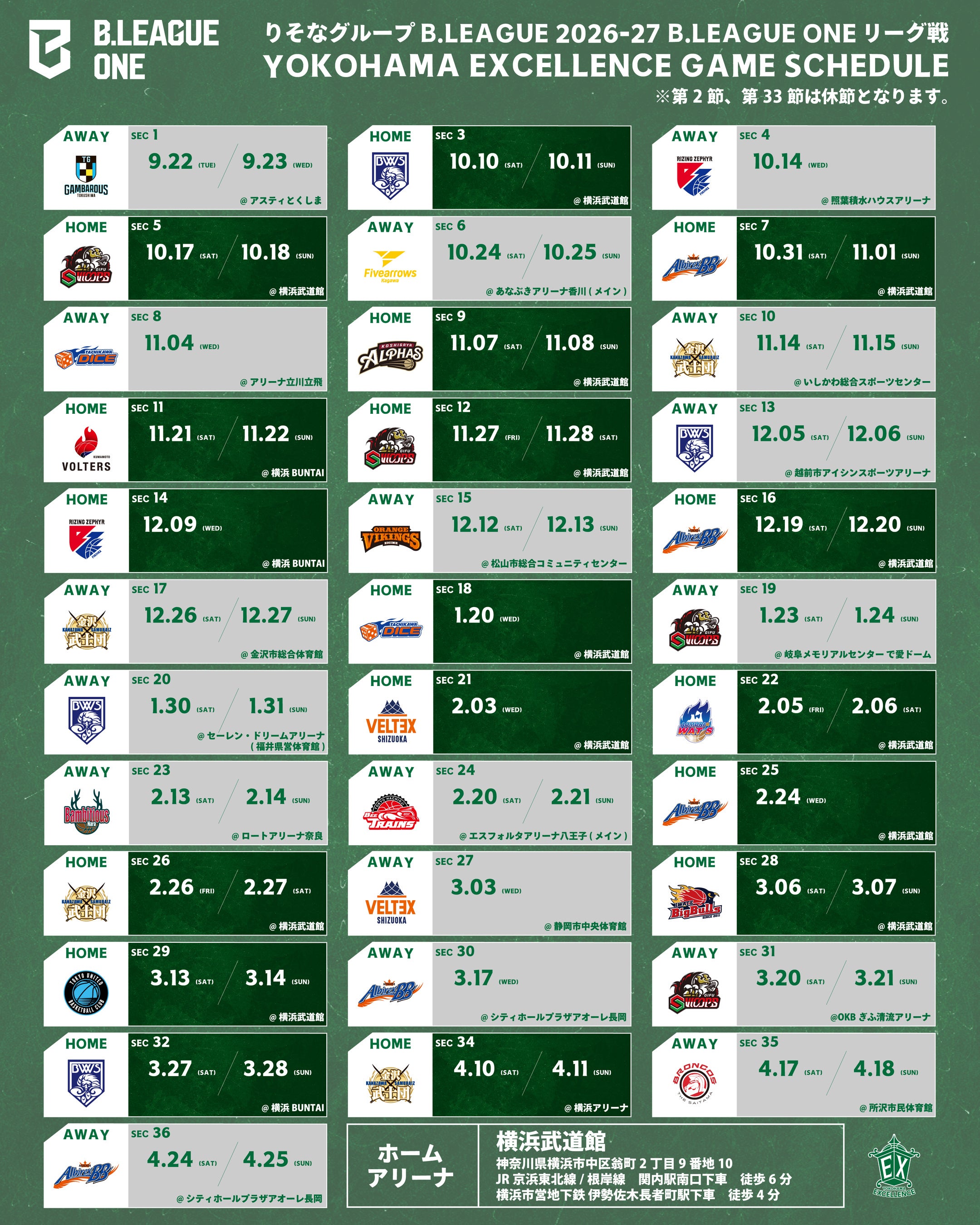 この度、「Bリーグ」(※外部リンクとなります。)より「りそなグループ B.LEAGUE 2026-27 B.LEAGUE ONE リーグ戦」の試合日程が発表されましたので、お知らせいたします。