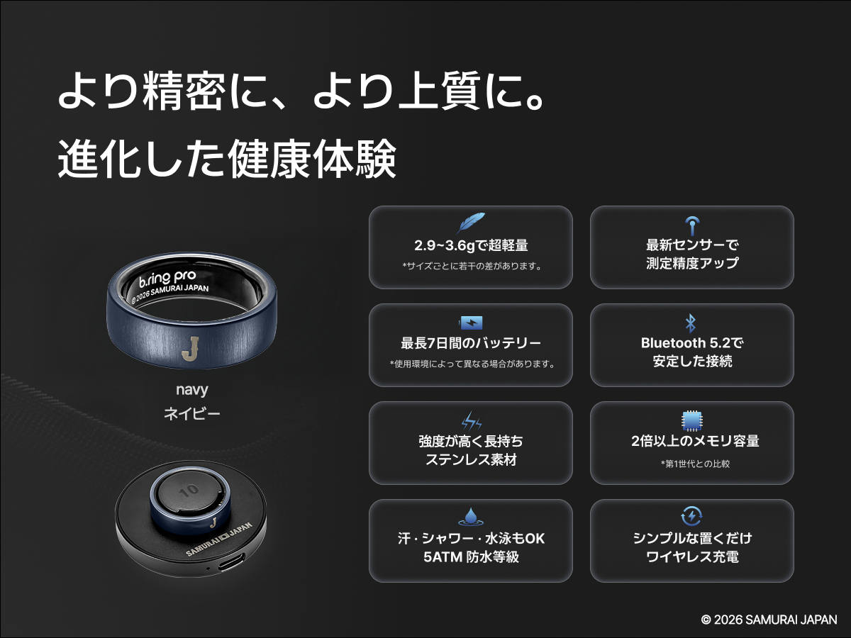 侍ジャパンコラボレーションモデルのスマートリングが登場。 本モデルは、最新のAIテクノロジーを搭載した「b.ring Pro」をベースモデルに採用し、侍ジャパンの 世界観を表現した特別デザインのスマートリングです。スポーツシーンはもちろん、日常生活にも自然 に溶け込むデザイン性と、高度な健康管理機能を兼ね備えています。