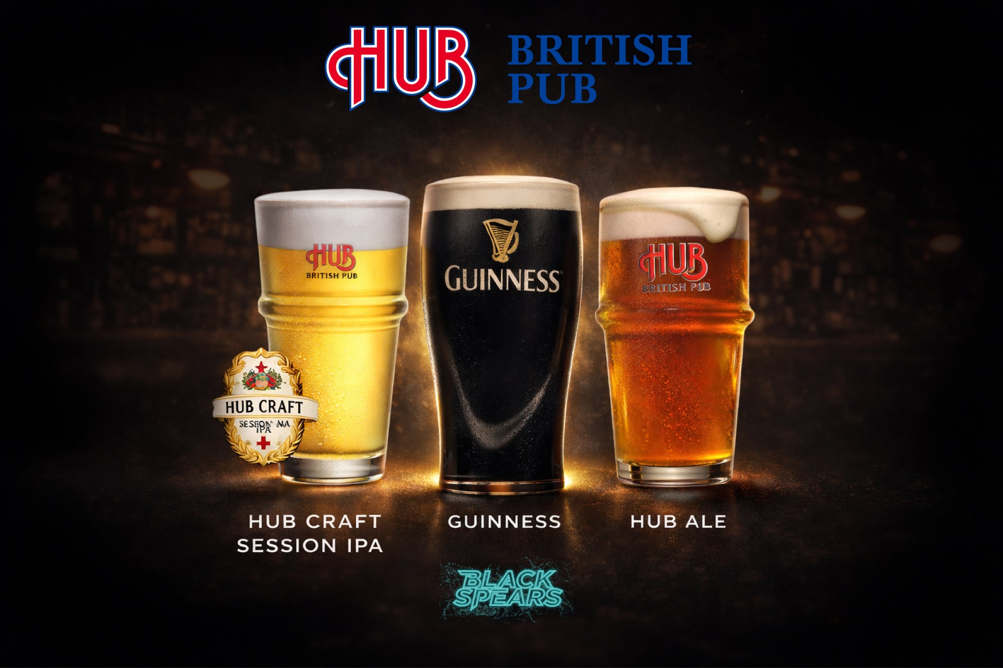 選りすぐりのモルトとホップを贅沢に使い、季節限定レシピで仕上げたHUBだけのオリジナルブランドの「HUB ALE」とアルコール4.5度と軽やかで華やかな柑橘系フルーツの香りが楽しめる「HUB CRAFT Session IPA」に加え、BLACK SPEARSのロゴが入ったこの日しか飲めないGUINNESSを販売します。
