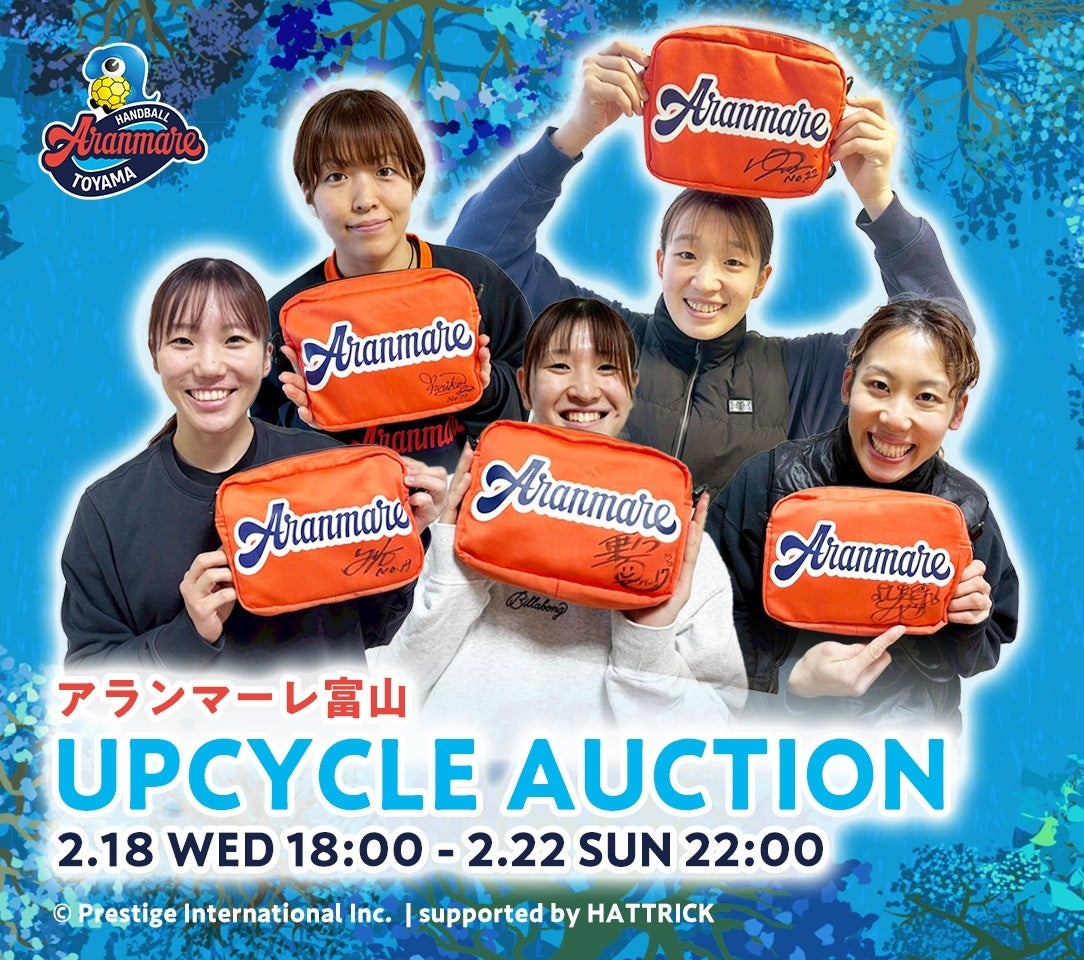 本オークションは、株式会社プレステージ・インターナショナル(本社:東京都千代田区、代表取締役:玉上進一)が運営する女子スポーツチーム、アランマーレ秋田(バスケットボールチーム)・アランマーレ山形(バレーボールチーム)・アランマーレ富山(ハンドボールチーム)の3チームが、バリュエンスジャパン株式会社(本社:東京都港区、代表取締役:冨田 光俊)が運営するスポーツチーム公認オークション「HATTRICK Auction」にて開催するアップサイクルプロジェクト「UPCYCLE AUCTION」です。