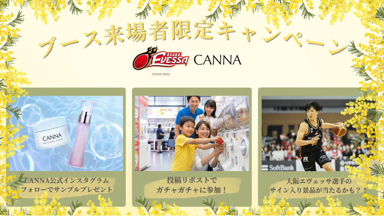 3月8日は「国際女性デー」。女性の活躍を祝福する日として世界中で認知されており、大阪エヴェッサのホームアリーナにも多くの女性ファンが来場します。季節の変わり目で肌ゆらぎが起こりやすい時期でもあることから、CANNAのスキンケアを気軽に体験できる機会として今回の出店を企画しました。