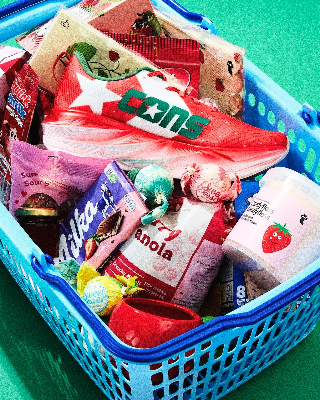 瑞々しい果実を彷彿とさせる鮮やかな赤色を基調に、ヘタをイメージしたグリーンをアクセントとして配置。さらに、イチゴのつぶつぶ(痩果)にはコンバースらしい星のモチーフをさり気なく散りばめることで、遊び心とブランドらしさを融合させています。厚底フォルムが特徴の「CONS RUNBOUNCE」にイチゴのカラーリングとディテールを大胆に落とし込み、ひと目で印象に残るポップでキャッチーな存在感を表現。履くたびに気分が弾むようなデザインが、走る時間をより楽しく彩ります。