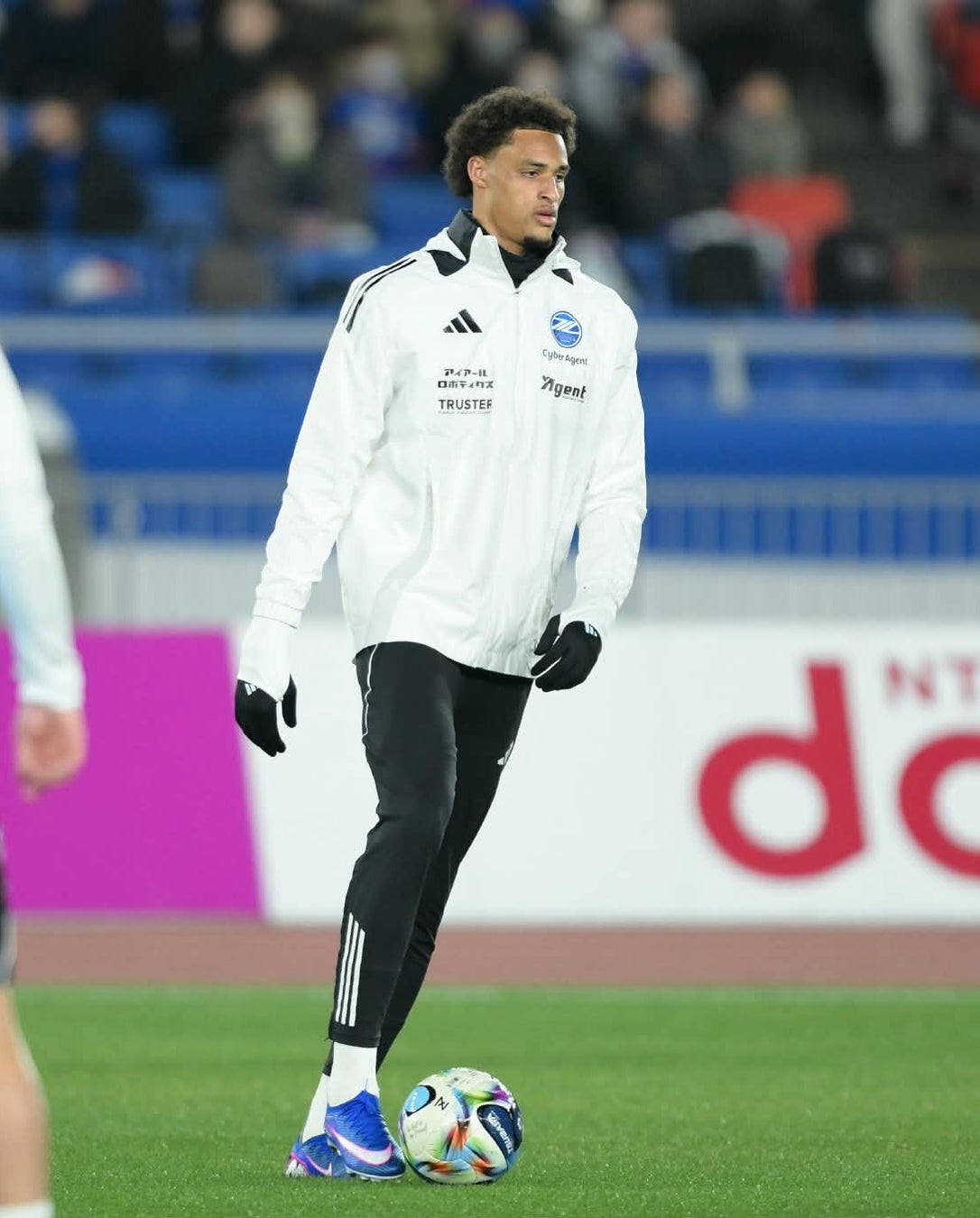 ・選手着用のウォーミングアップウェア(カタカナで社名を掲出しております。)