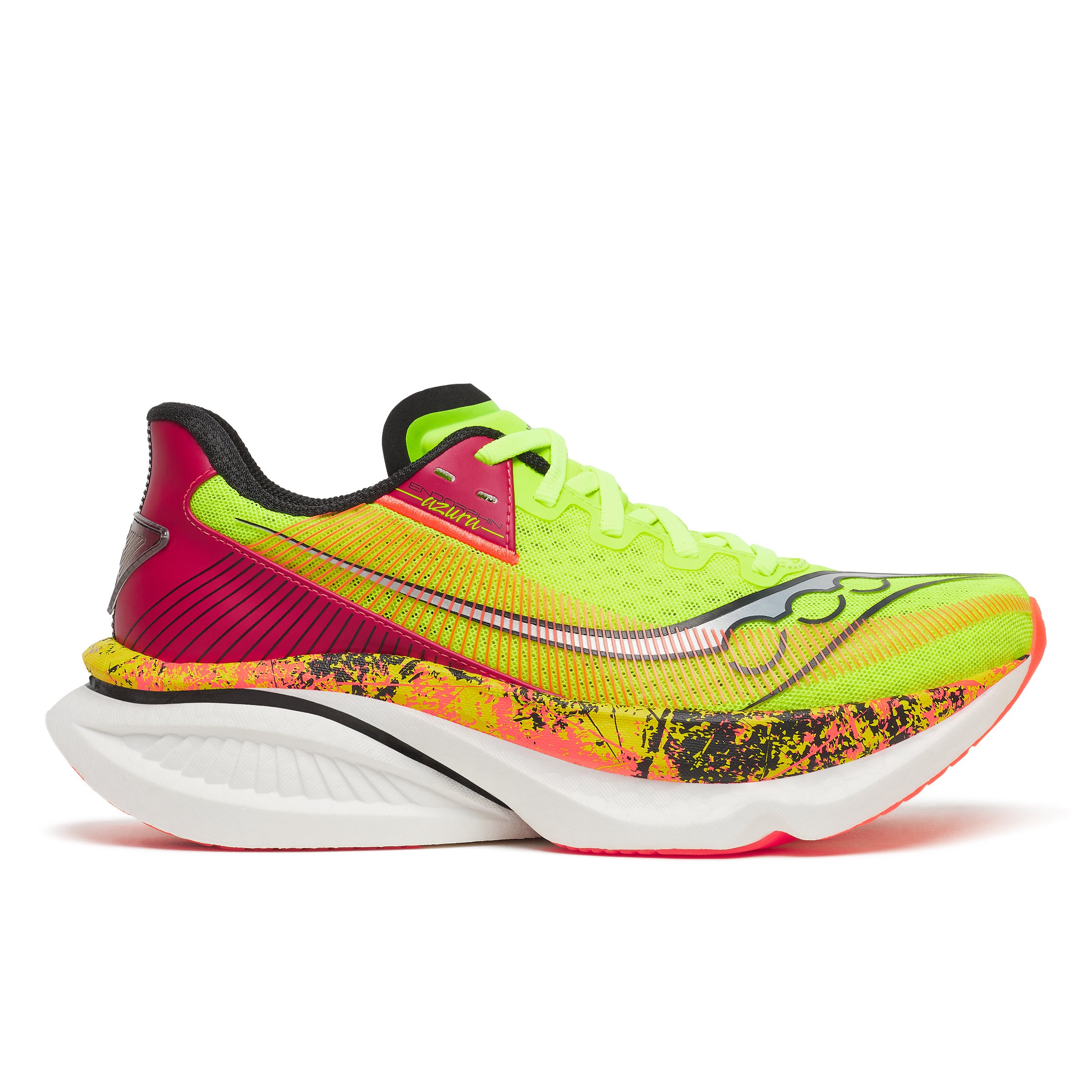 本作は、サッカニーが誇るスピードモデルの系譜「Endorphin」シリーズの最高峰クッショニング素材「PWRRUN PB」をフルレングスで搭載。あえてプレートを排除することで、足本来の自由な動きを引き出しつつ、ヒール高40mmの圧倒的なエネルギーリターンを実現しました。独自のロッカー構造「SPEEDROLLテクノロジー」との相乗効果により、スムーズな足運びと異次元の推進力を提供します。