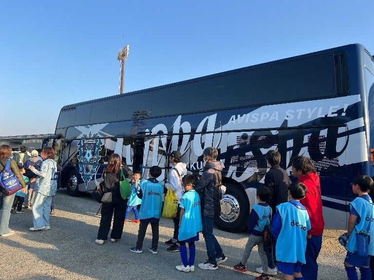 食事が終わった子どもたちは、順番に次のアクティビティへ。選手たちが普段から試合や練習の準備をしているクラブハウスの見学です。普段は関係者しか入れないエリアを見学できるということで、子どもたちはわくわくした様子でした。一部屋ずつコーチに案内されると、子どもたちはみんな楽しそうに声を上げながらプロが過ごしている空間を体感していました。クラブハウス見学の後は、選手が普段移動するために使用しているアビスパ福岡のラッピングバスへの乗車体験です!