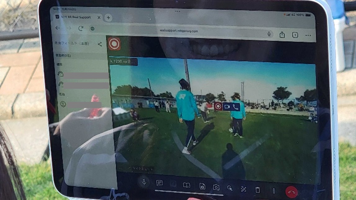 また、今回の未来フィールドでは全国初の取り組みとして、株式会社NTTコノキューのXRグラス「MiRZA」を用いて、サッカー教室の様子をリアルタイムで離れた場所に映像伝送するイベントを実施しました。