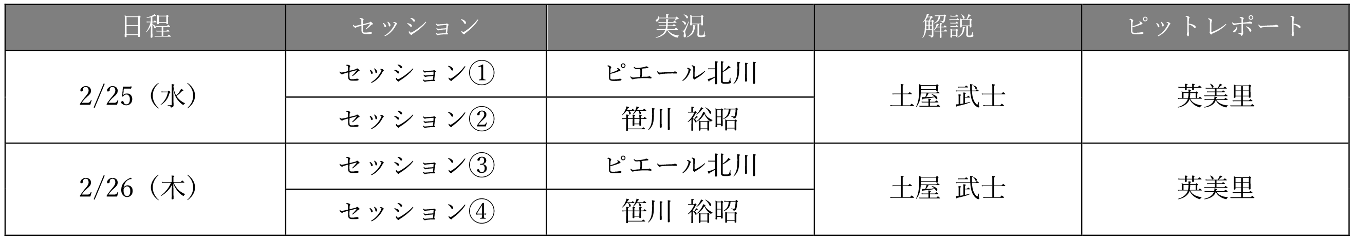 ※今回の公式テストは公式放送と場内放送は同じ出演者となります。