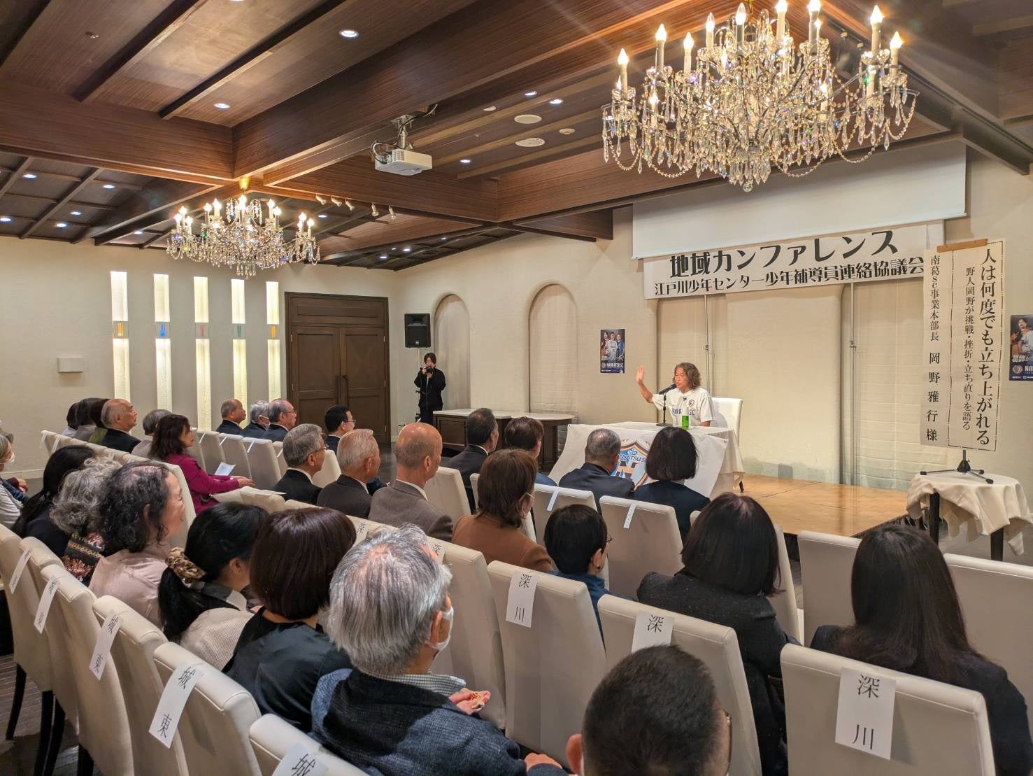 本講演は、葛飾区、江戸川区、墨田区、江東区の少年補導員および関係者、約100名を前に実施されました。地域で非行防止や少年の立ち直り支援に取り組む皆さまに向け、岡野はこれまでの経験をもとに「挑戦」「挫折」「仲間の存在」「地域とのつながり」をテーマに講話を行いました。
