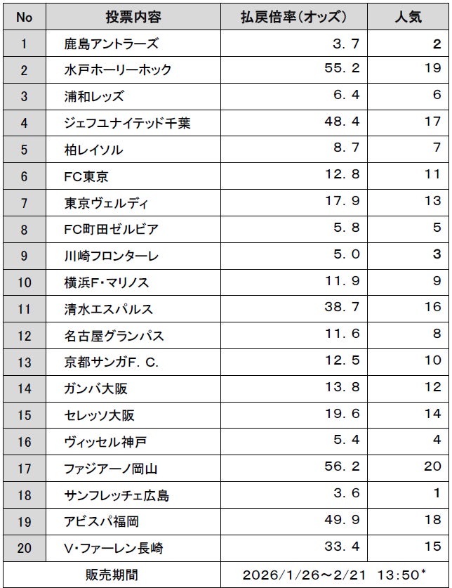 1番人気は、昨シーズン4位のサンフレッチェ広島で、払戻倍率(オッズ)は3.6倍!2番人気は、昨シーズン優勝の鹿島アントラーズで、払戻倍率(オッズ)は3.7倍、3番人気は、昨シーズン8位の川崎フロンターレで、払戻倍率(オッズ)は5.0倍となっています。