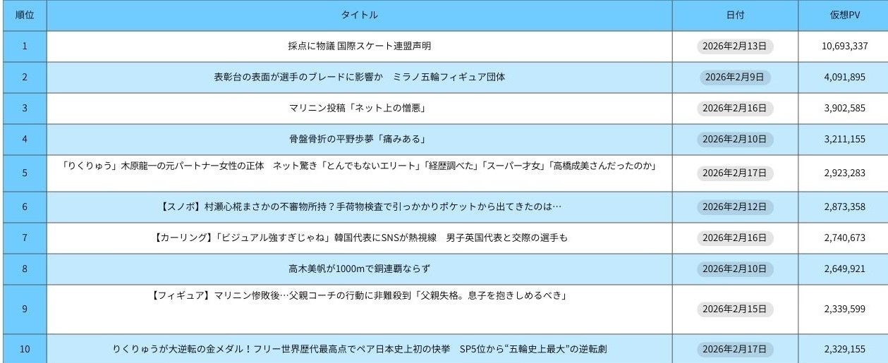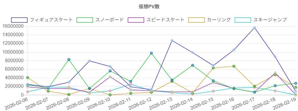 2026年2月6日に開催された冬季オリンピック人気上位5種目としてランキング形式にしましたが、どの競技も話題性があり、記事数も多く、PVが伸びているのを確認できます。怪我やトラブルの記事も多く見受けられますが、閉幕までの残り短い期間、日本人選手、海外選手の活躍によって記事やPVが増え、メディアでの露出も多くなることが予想されます。今後もご活躍に注目していきたいです。