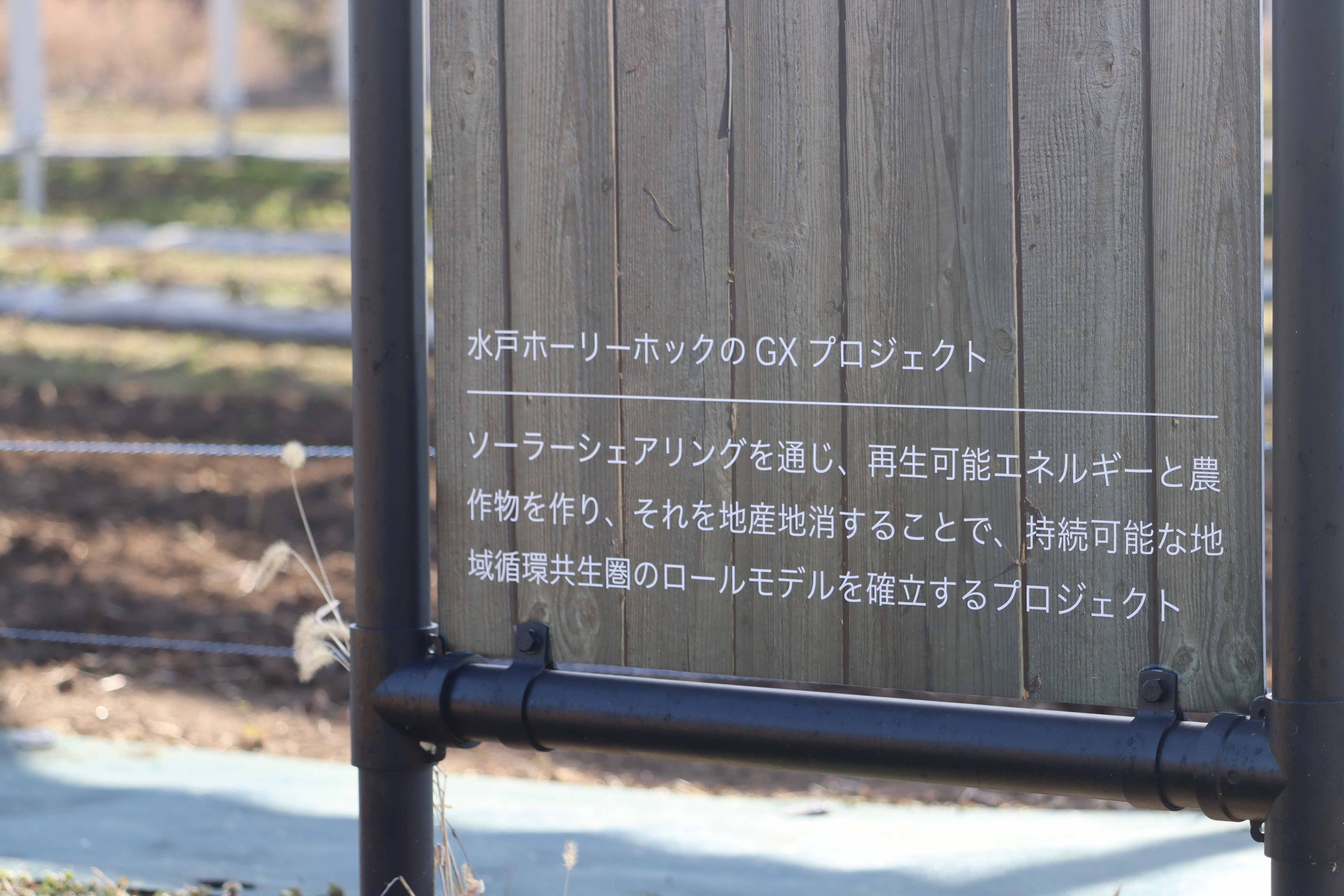 水戸ホーリーホックでは、ホームタウンの一つである城里町に広がる耕作放棄地を活用し、特殊な太陽光パネルを設置することで、地上では化学肥料を使わない農業を行いながら、上部空間で再生可能エネルギーを創出する「ソーラーシェアリング」に取り組んでいます。