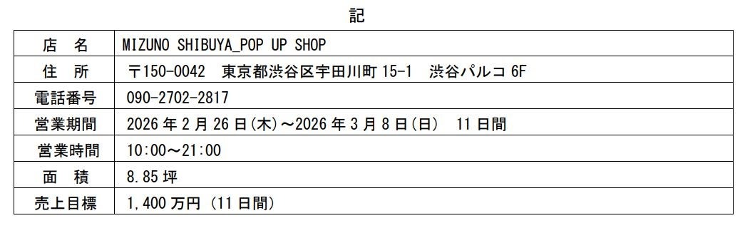 ミズノは、2月26日から11日間限定で、ポップアップショップ「MIZUNO SHIBUYA_POP UP SHOP」を渋谷PARCO内にオープンします。