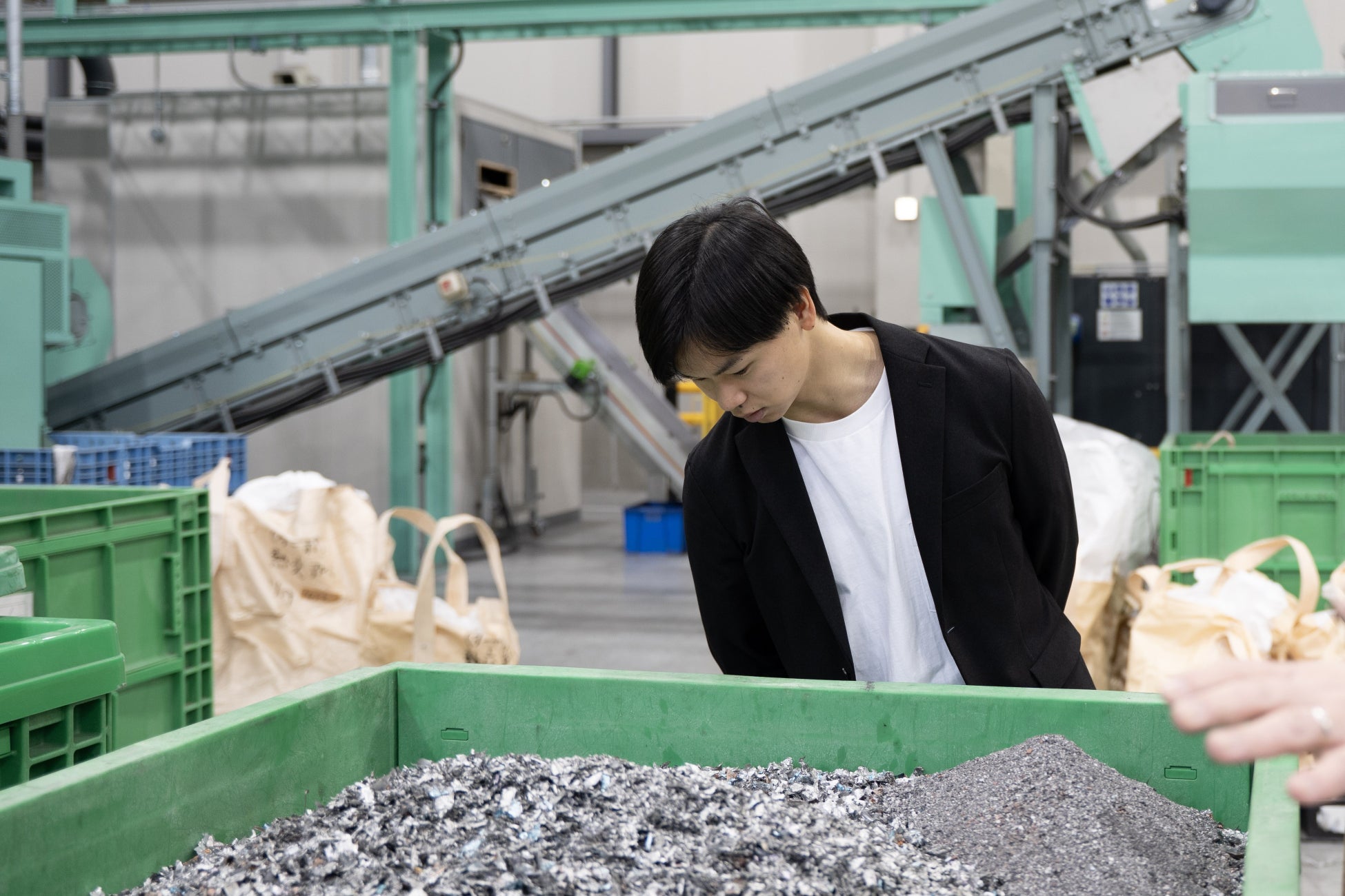 家電リサイクルの過程で発生する鉄や銅、アルミ等を選別する設備やプラスチックペレットの成形を行う設備の見学を行い、渡辺選手から「色々な方法で資源を分別・回収しているのですね。施設もオシャレです!」コメントをいただきました。