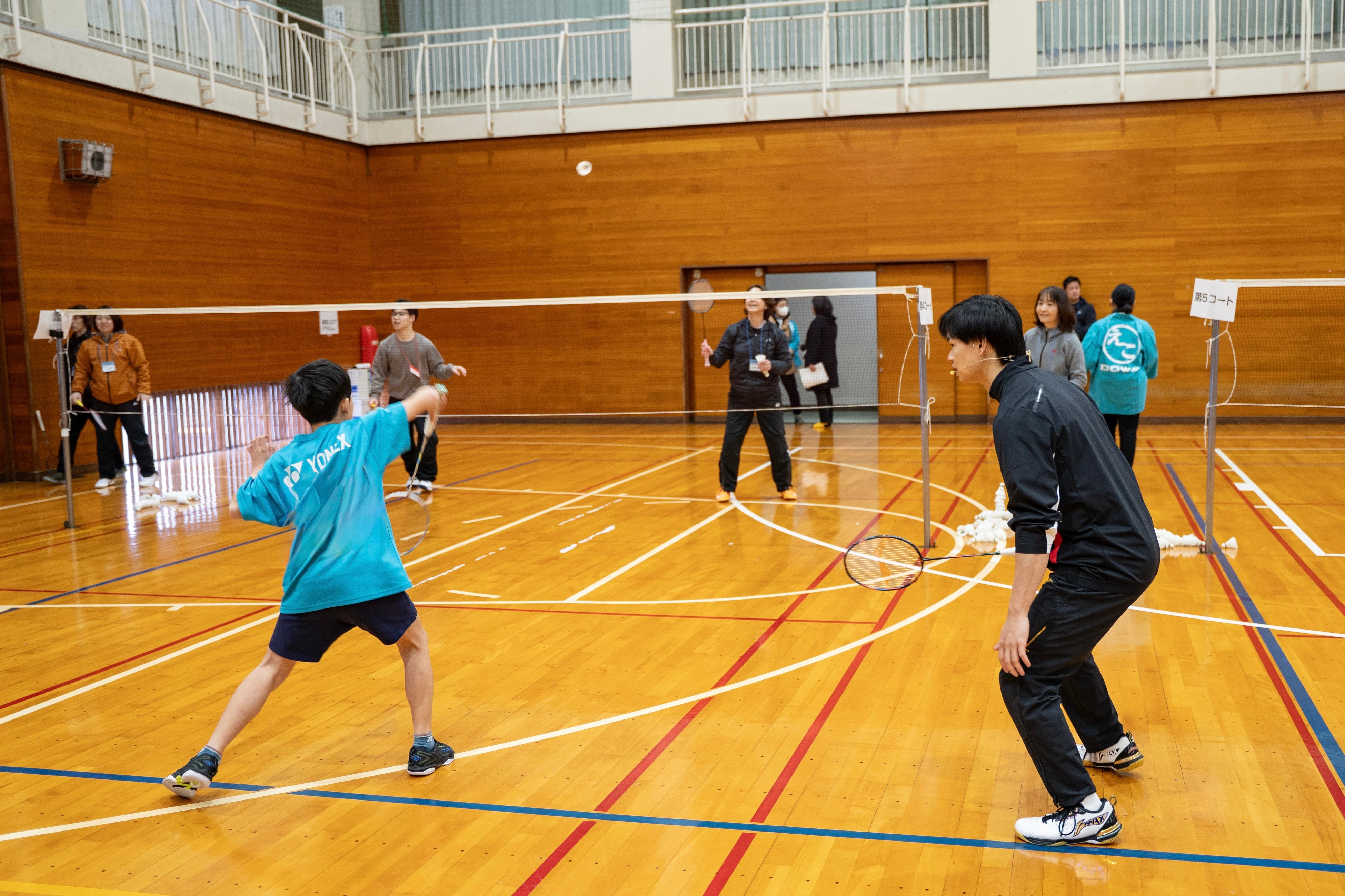 イベント後半には、中学生および社会人の代表ペア3組が一流選手に挑むエキシビジョンマッチを実施しました。世界トップクラスの力強いスマッシュやテクニックを前に参加者、保護者共に大きな歓声が上がり、熱気あふれる交流の場となりました。