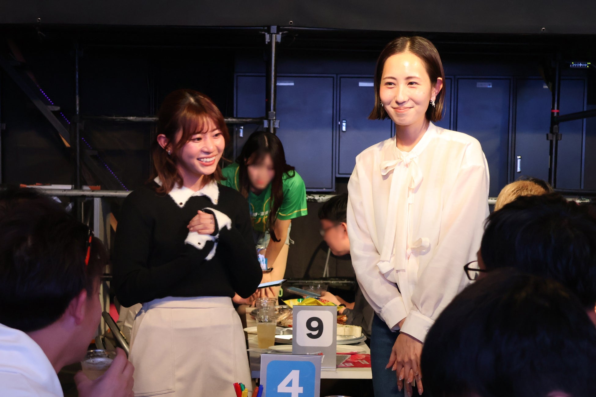 さらに、両選手が来場者のテーブルを回る懇親タイムも設けられ、直接言葉を交わしたり写真撮影に応じたりするなど、ファンにとって特別なひとときとなりました。選手との距離の近さに、会場には喜びの表情が広がり、終始和やかな雰囲気の中で交流が行われました。