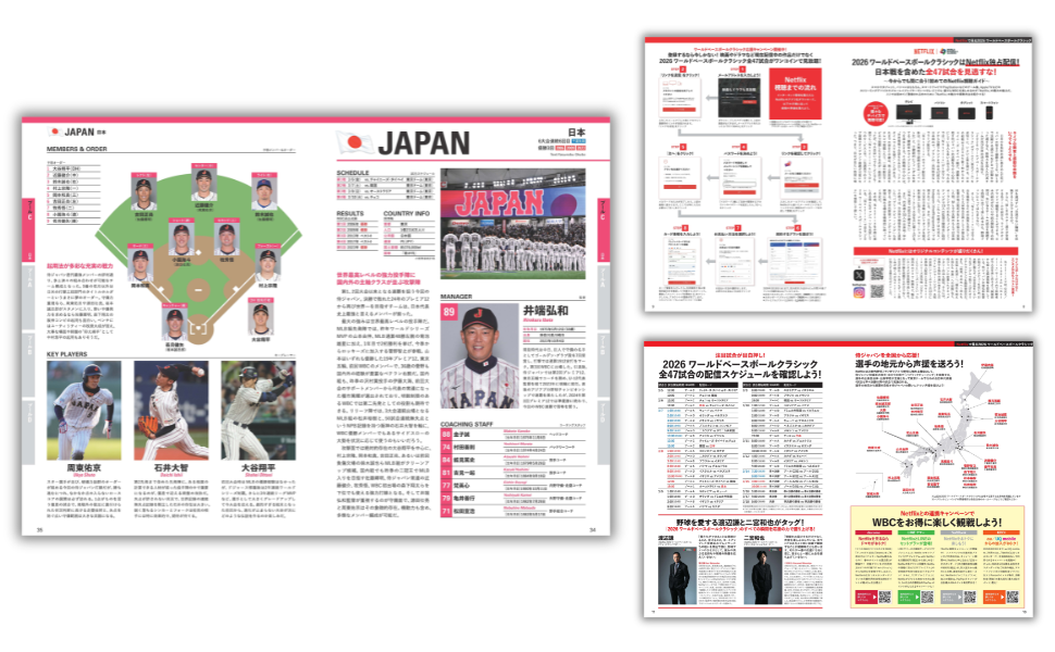 WBC全47試合を独占配信するNetflixでは、今大会をより楽しむためのオリジナルコンテンツが満載です。初めての方でも安心してWBCを視聴するための登録手順やNetflixだからこその大会の楽しみ方、そして全47試合の試合日程を日本時間で表記した配信スケジュールなど、漏れなく掲載しています。また、井端弘和監督率いる侍ジャパンの見どころと選手名鑑を掲載し、侍ジャパン30選手の情報も満載です。