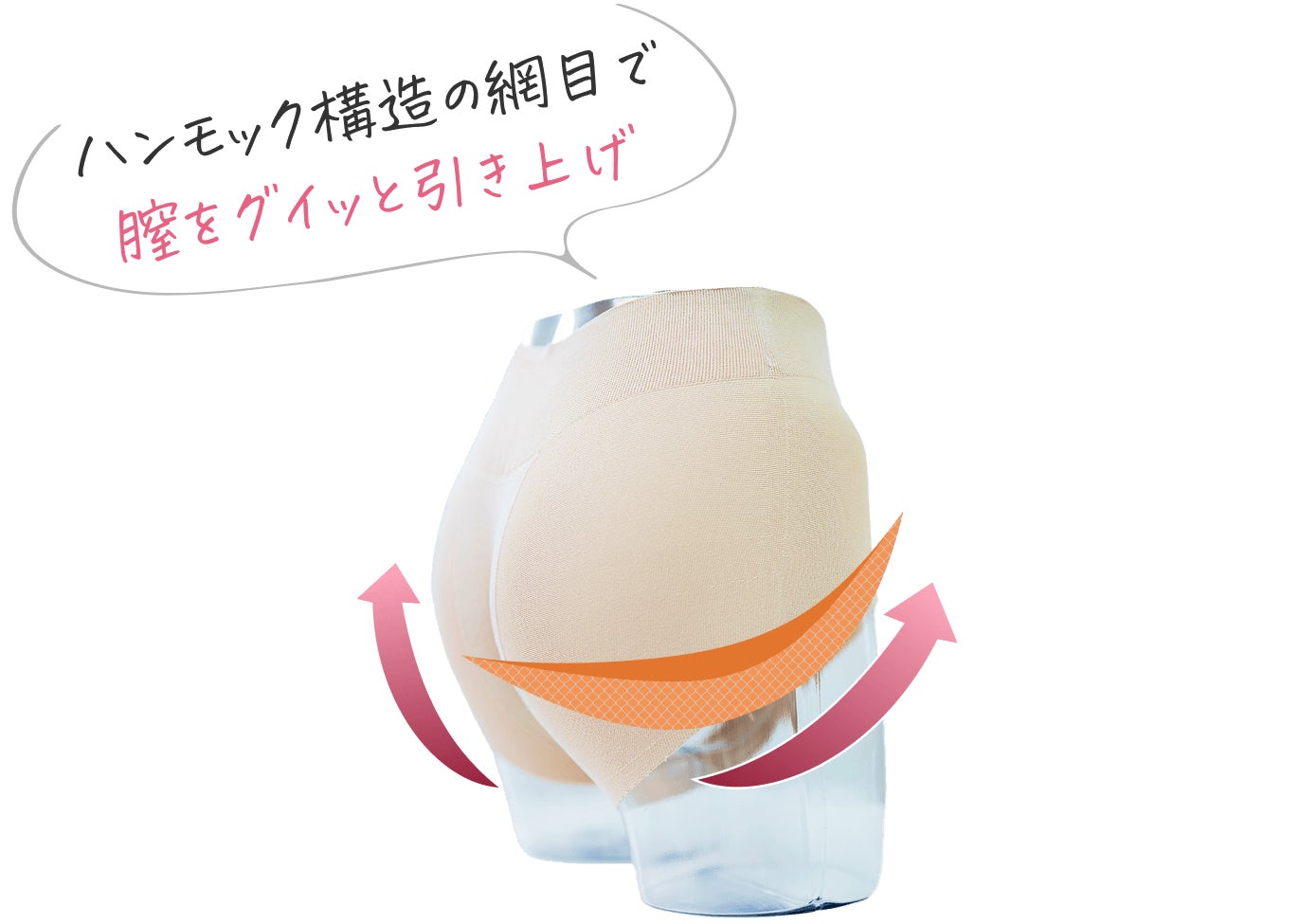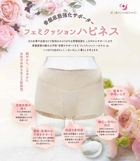 骨盤底筋を下から支えるオーバル構造を特徴とする専用サポーター「フェミクッションハピネス」は、2025年9月に発売され、同年12月に構造改良を実施しました。陰部を支えるオーバル部分を従来より約30%ふくらませることで、下から支える構造を強化しました。また、新たな糸と縫製方法を採用し、肌当たりへの配慮と着用時の快適性向上を図っています。