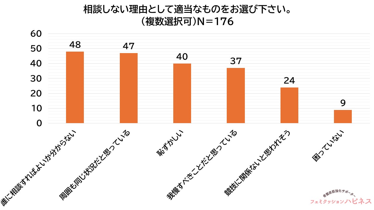 相談しない理由(176人中、複数回答)としては、「誰に相談すればよいか分からない」が27.3%(48人)、「周囲も同じ状況だと思っている」が26.7%(47人)、「恥ずかしい」が22.7%(40人)、「我慢すべきことだと思っている」が21.0%(37人)、「競技に関係ないと思われそう」が13.6%(24人)でした。