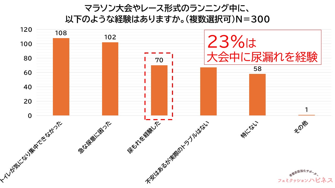 マラソン大会やレース形式のランニング中の経験を尋ねたところ、「トイレが気になり集中できなかった」と回答した人は36.0%(108人)、「急な尿意に困った」は34.0%(102人)でした。さらに、23.3%(70人)が「尿漏れを経験した」と回答しています。