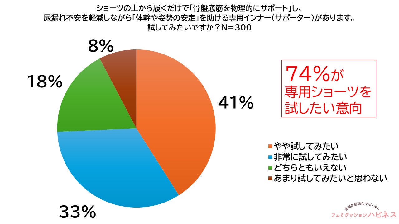 また、ショーツの上から着用し骨盤底筋を物理的にサポートする専用インナーについては、「非常に試してみたい」が33.3%(100人)、「やや試してみたい」が41.0%(123人)で、合計74.3%(223人)が関心を示しました。