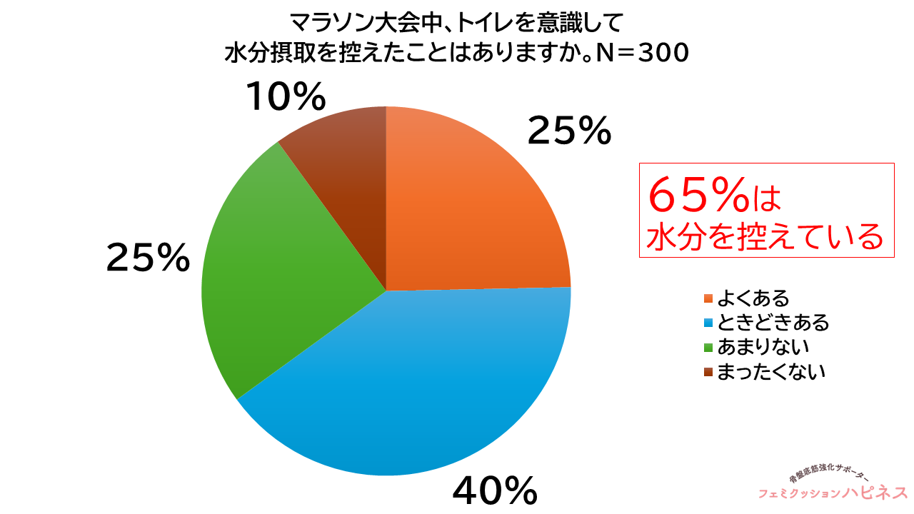 大阪・東京・名古屋と主要大会が続くマラソンシーズンを前に行った本調査では、65.0%(195人)が大会中に水分を控えた経験があると回答し、23.3%(70人)が尿漏れを経験、さらに58.7%(176人)が誰にも相談していない実態が明らかになりました。